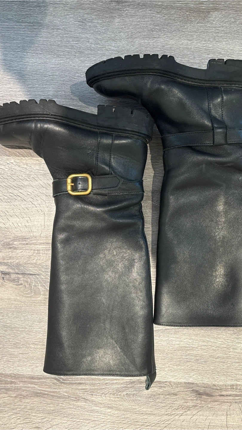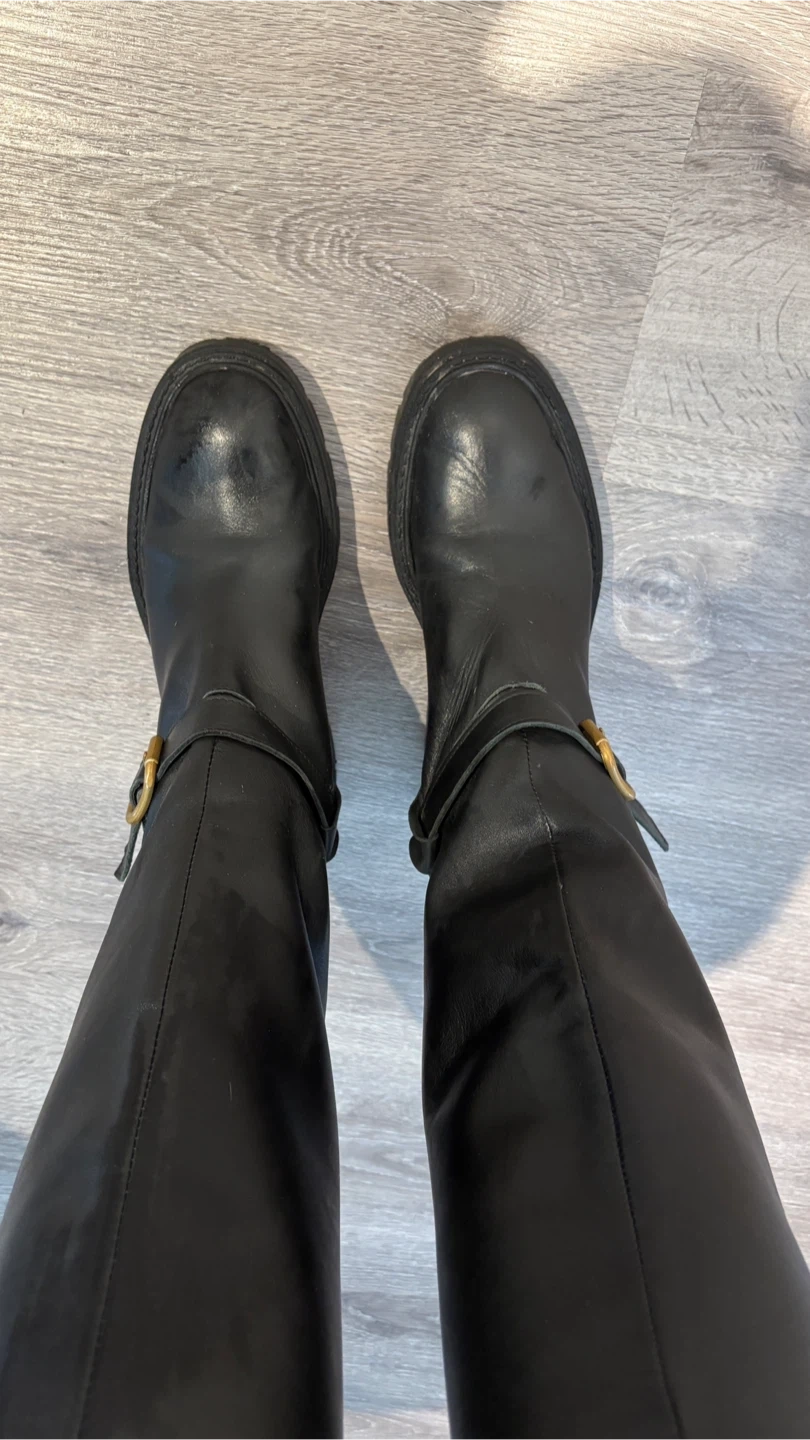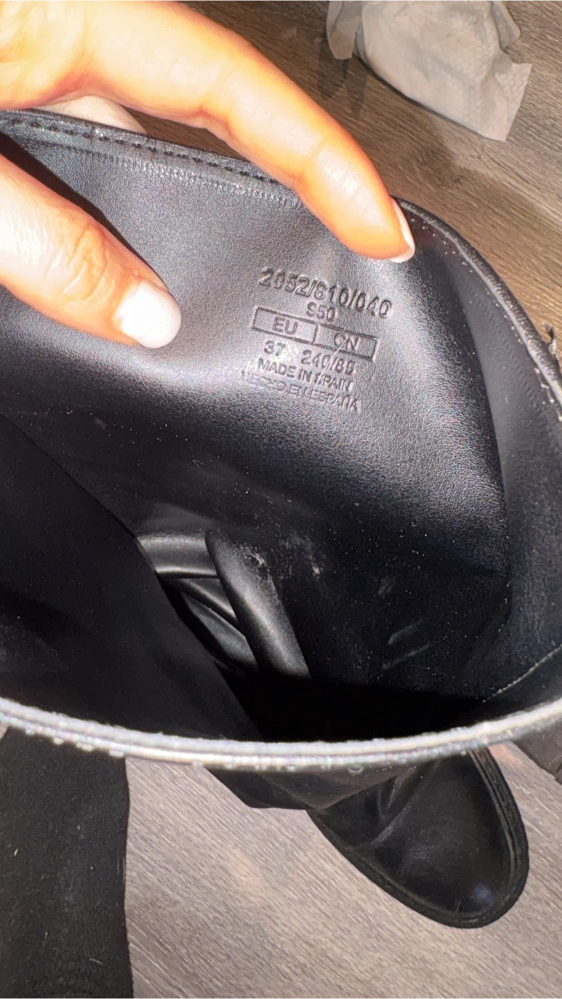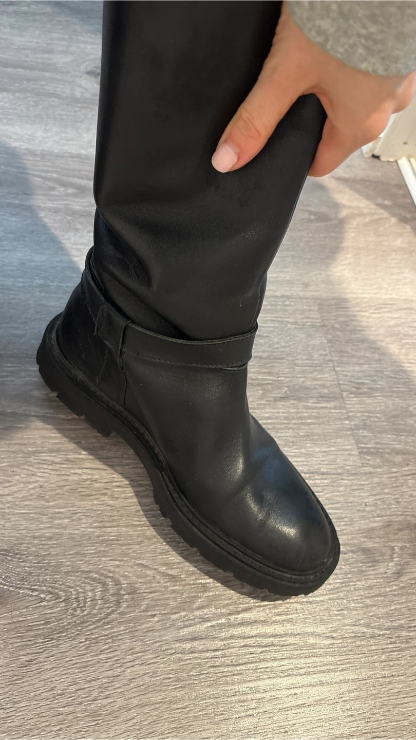 Selling a pair of Zara black leather knee-high boots in size 37, (24cm) These boots have a stylish design and are perfect for adding a touch of elegance to your outfits. They show some signs of wear, but are still in good condition!
