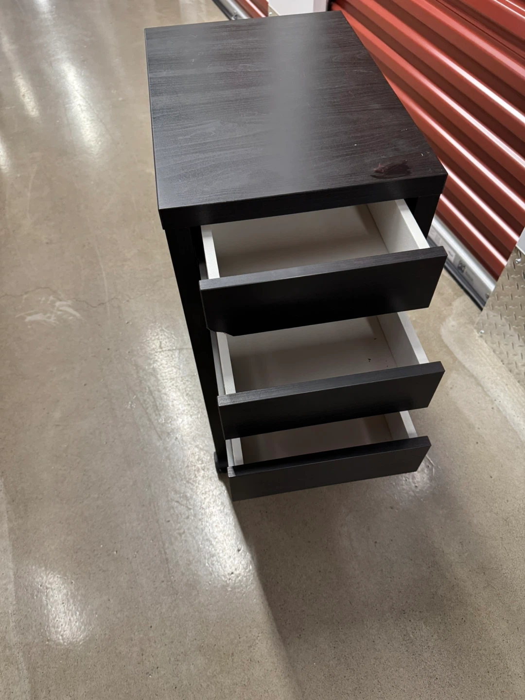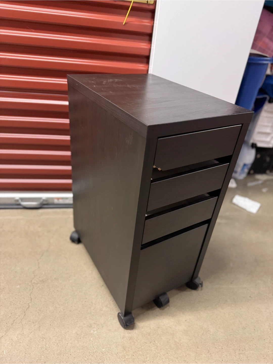 Here’s a dark brown rolling file cabinet! It has a few scratches but is still in great condition. Perfect for your home office or study space. A small dent on front due to moving but it is like new
