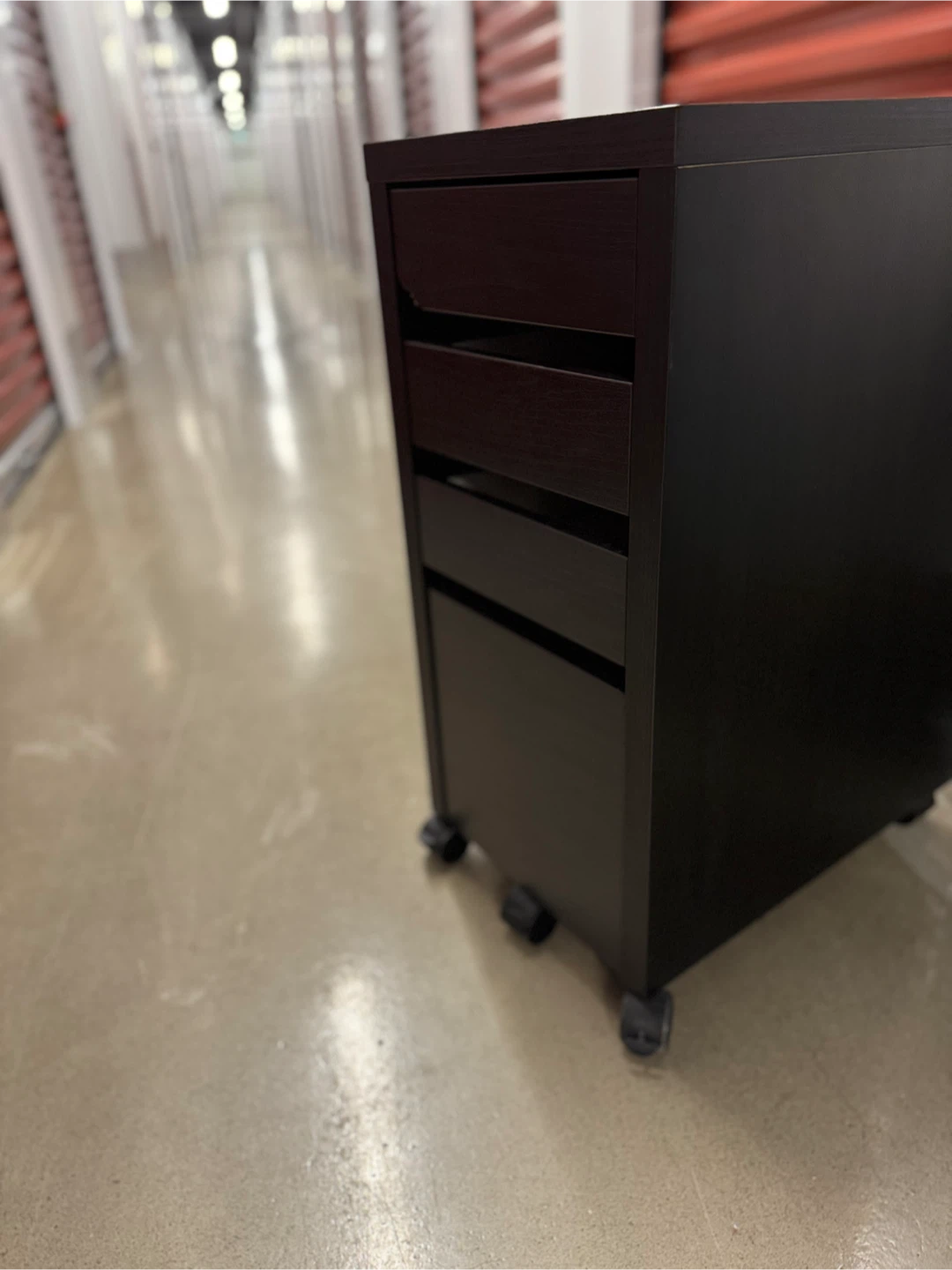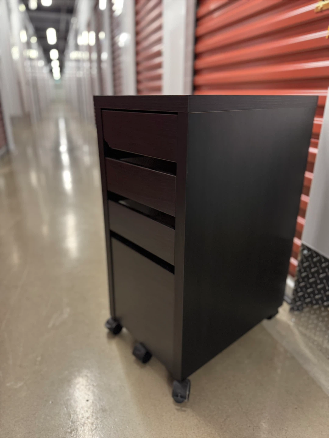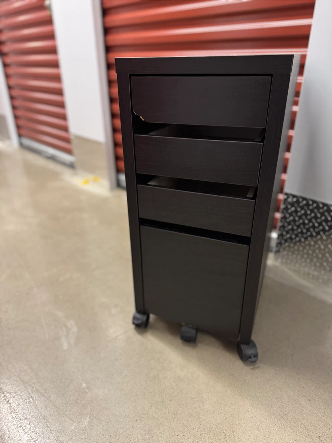 Here’s a dark brown rolling file cabinet! It has a few scratches but is still in great condition. Perfect for your home office or study space. A small dent on front due to moving but it is like new