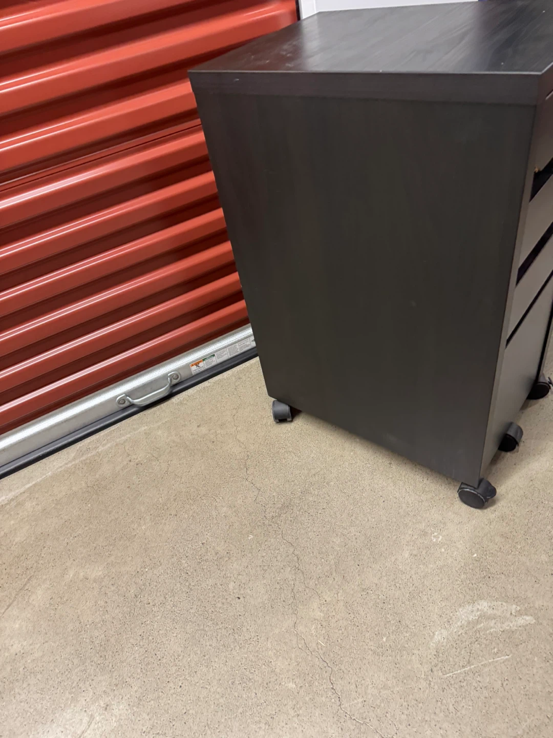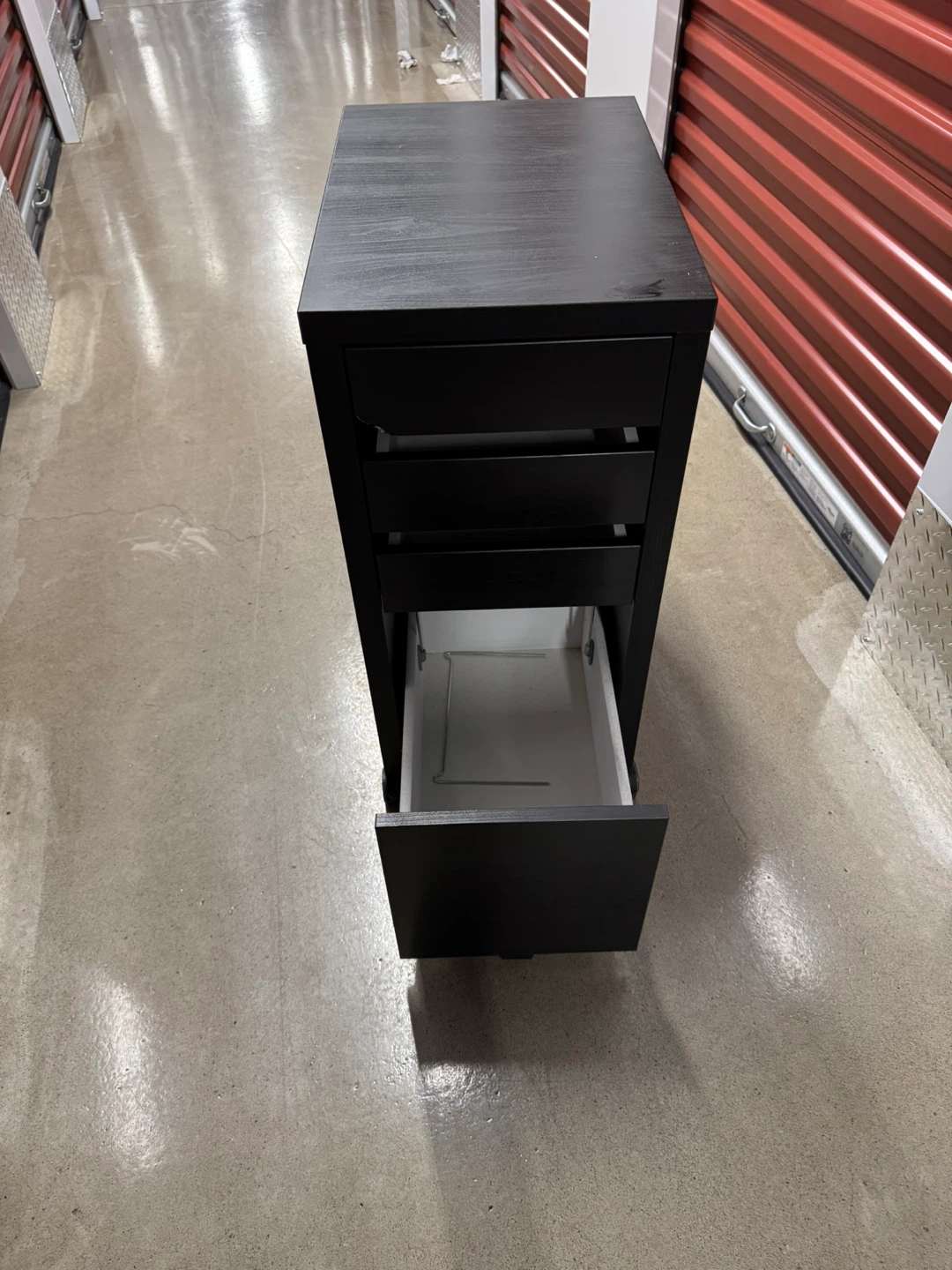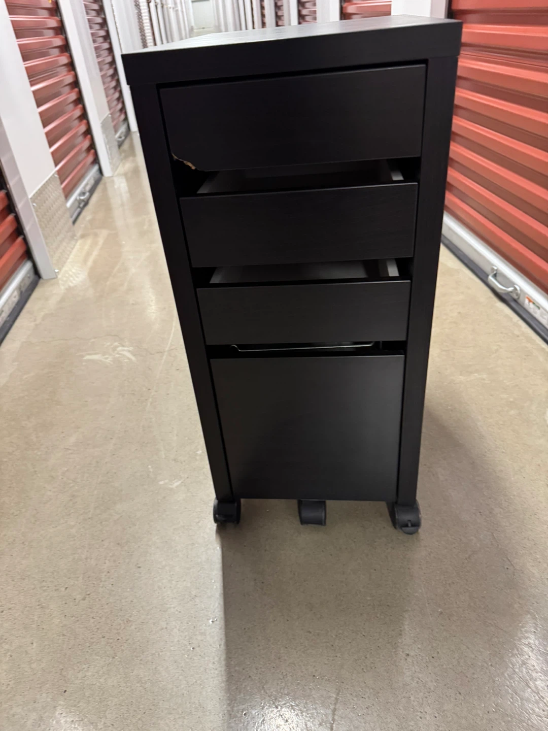 Here’s a dark brown rolling file cabinet! It has a few scratches but is still in great condition. Perfect for your home office or study space. A small dent on front due to moving but it is like new