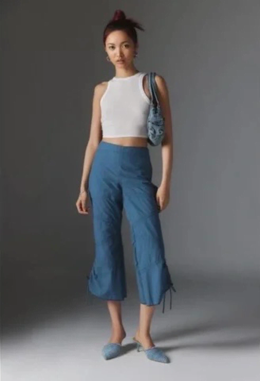 Stylish cropped cargo pants with adjustable ruched detailing and drawstring ties at the hem. These pants offer a unique silhouette and a comfortable fit. Made from a durable fabric, they're perfect for casual wear.