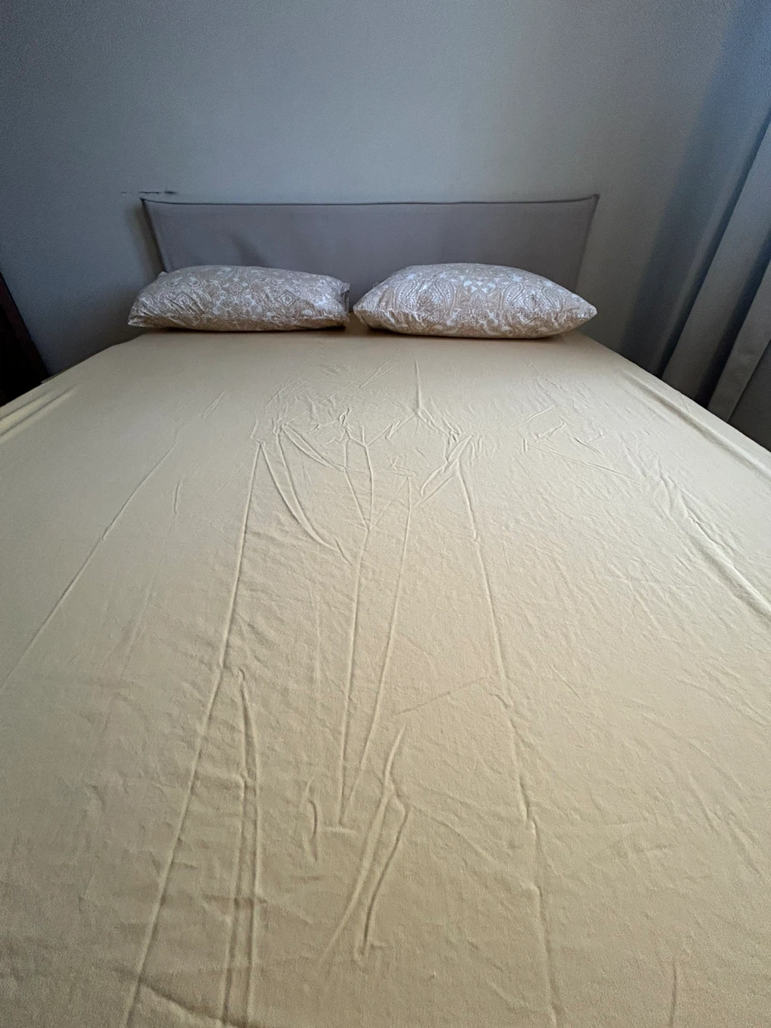 Selling a queen bed frame with a fabric headboard. It comes with two decorative pillows. Includes a fitted sheet in a light yellow colour with mattress.