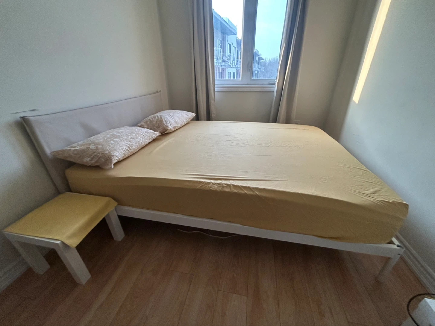 Selling a queen bed frame with a fabric headboard. It comes with two decorative pillows. Includes a fitted sheet in a light yellow colour with mattress.