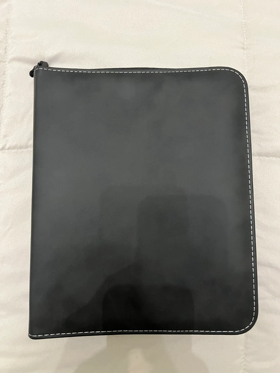 This is a black binder with a zippered closure. It features a sturdy construction and includes multiple clear plastic sleeves inside for organizing items. It's great for storing cards. Top loader fits.