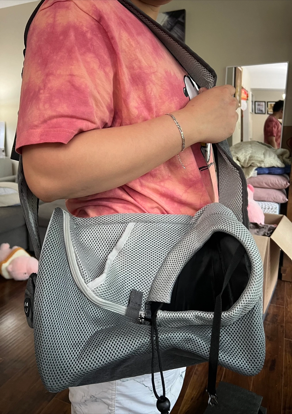 Grey pet carrier. Multiple pockets. Breathable mesh. Adjustable strap. Suitable for small pets. Can fit small dogs or cats. Brand new