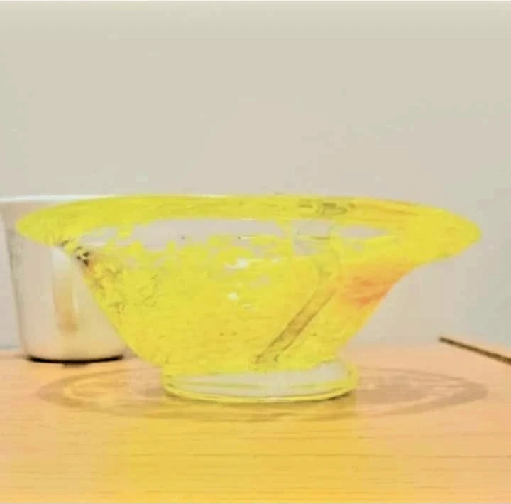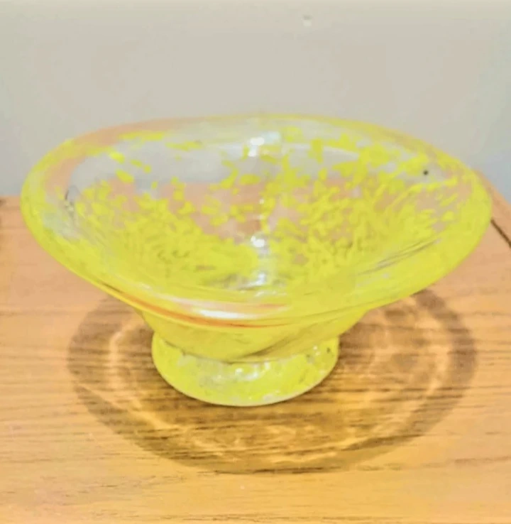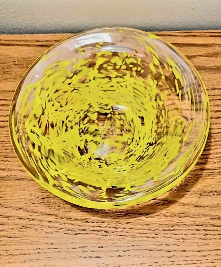 If you're looking for a vibrant piece of glass art, this Kosta Boda bowl is a must-have. The unique yellow swirls create a mesmerizing pattern that will captivate your attention. Don't miss out on the chance to add this charming bowl to your collection. Act fast, because if the ad is up, it's still available!