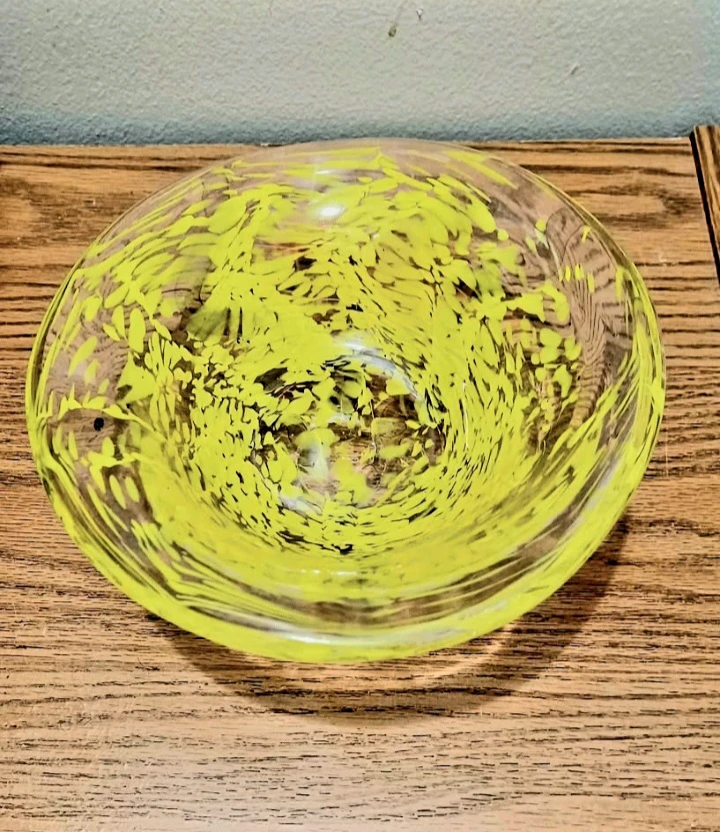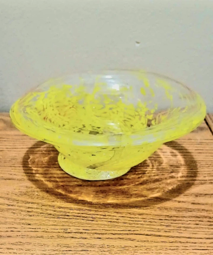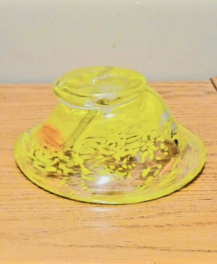 If you're looking for a vibrant piece of glass art, this Kosta Boda bowl is a must-have. The unique yellow swirls create a mesmerizing pattern that will captivate your attention. Don't miss out on the chance to add this charming bowl to your collection. Act fast, because if the ad is up, it's still available!