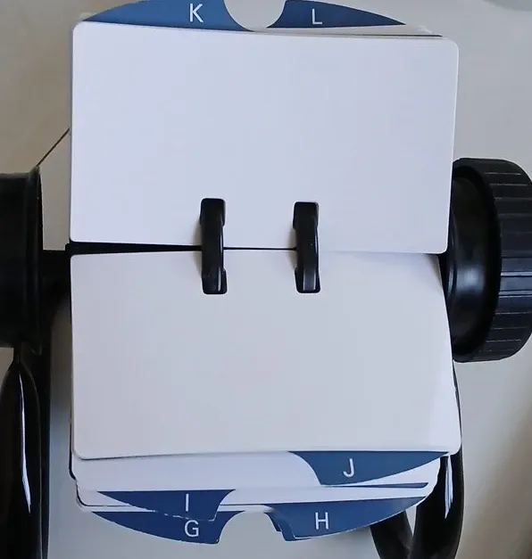 This is a white rotary card file holder. It's designed for organizing business cards or contact information. The holder has tabs with letters for easy sorting.