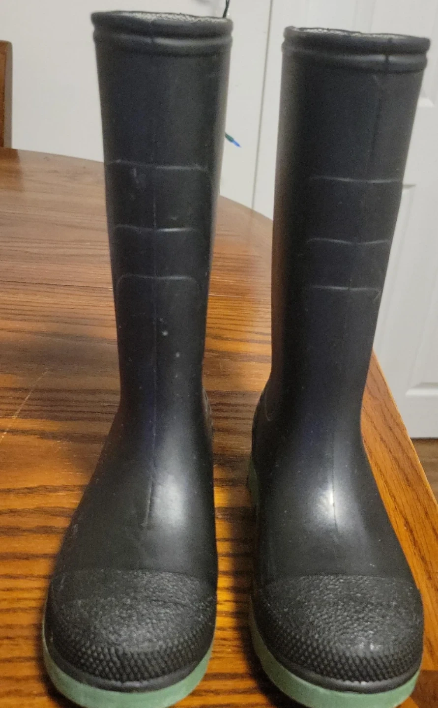 These are a pair of boys black rain boots, size 12, never worn. They have a green sole and are in good condition. Perfect for rainy days!
