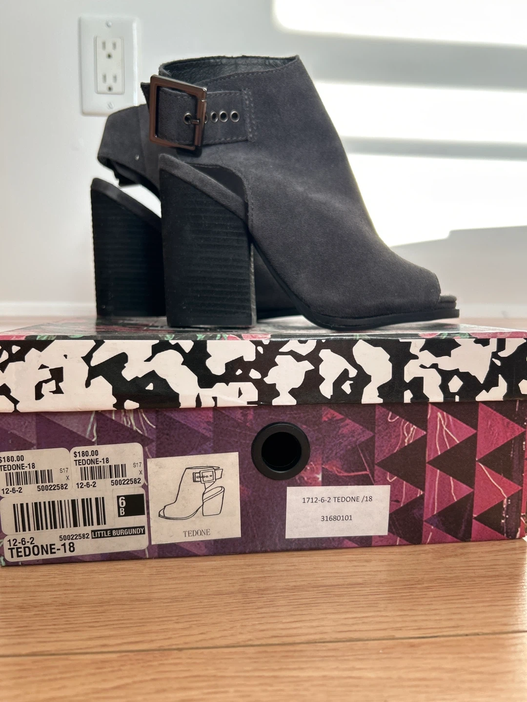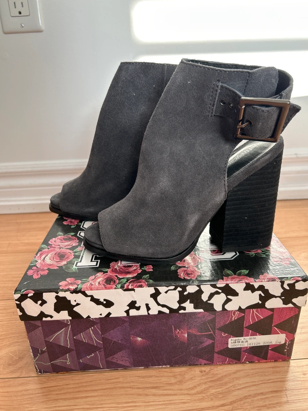 These are a pair of brand new Jeffrey Campbell Tedone open-toe booties in a lovely gray suede! They feature a chunky heel and a stylish buckle detail. The size is 6. Comes with the original box!