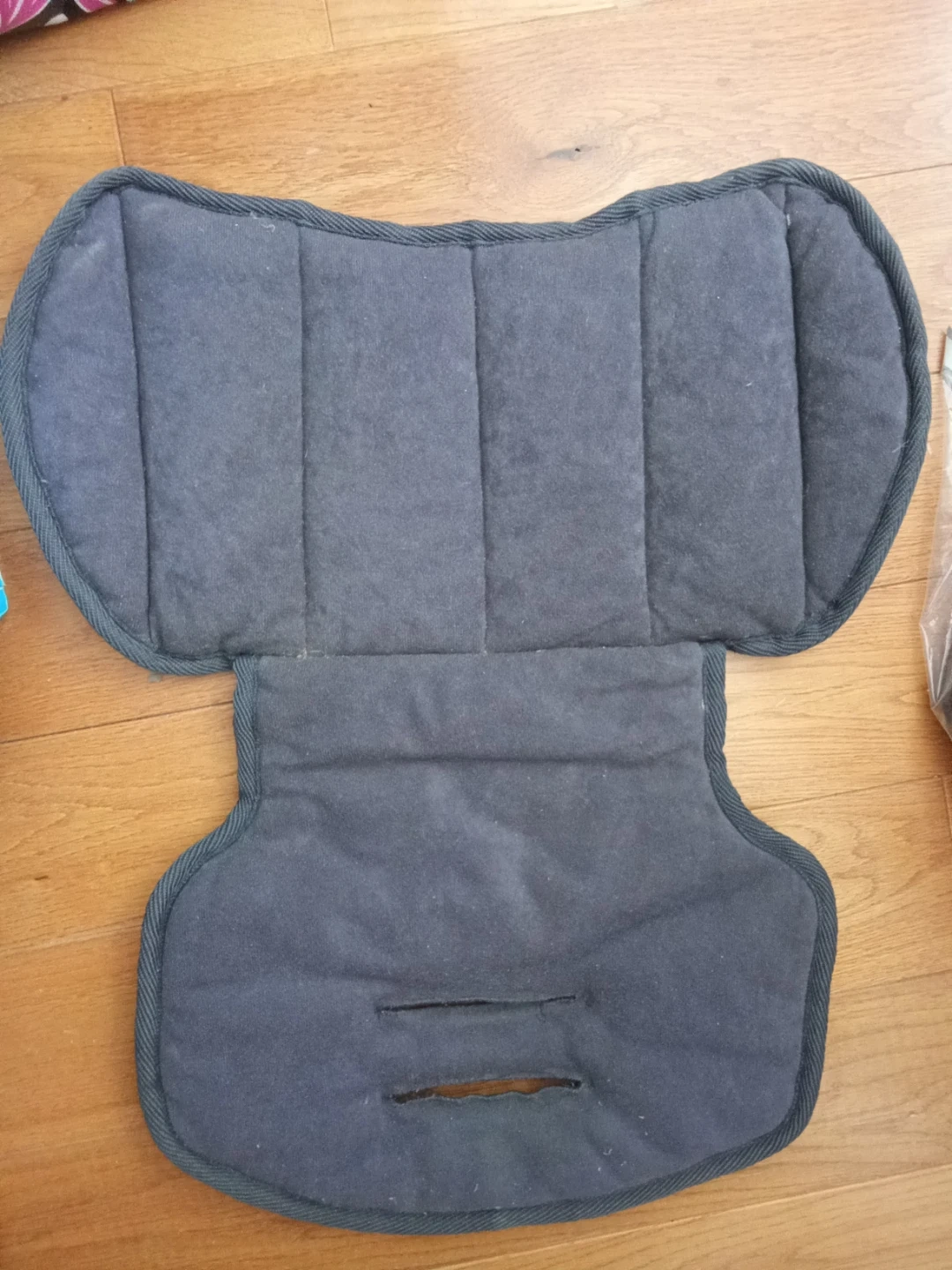 This is a padded seat liner for a stroller or car seat. It's a dark grey colour. It's made of soft fabric with quilting on the top section. It has slots for harness systems.
