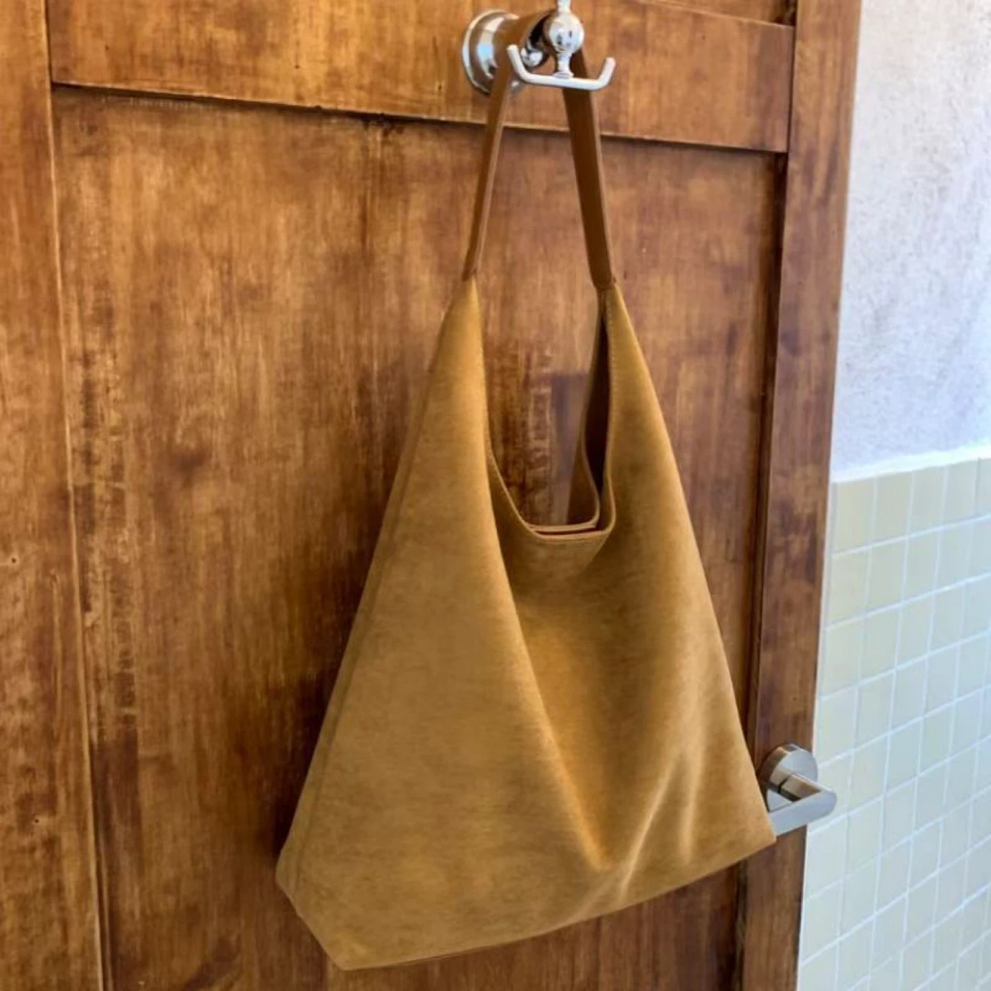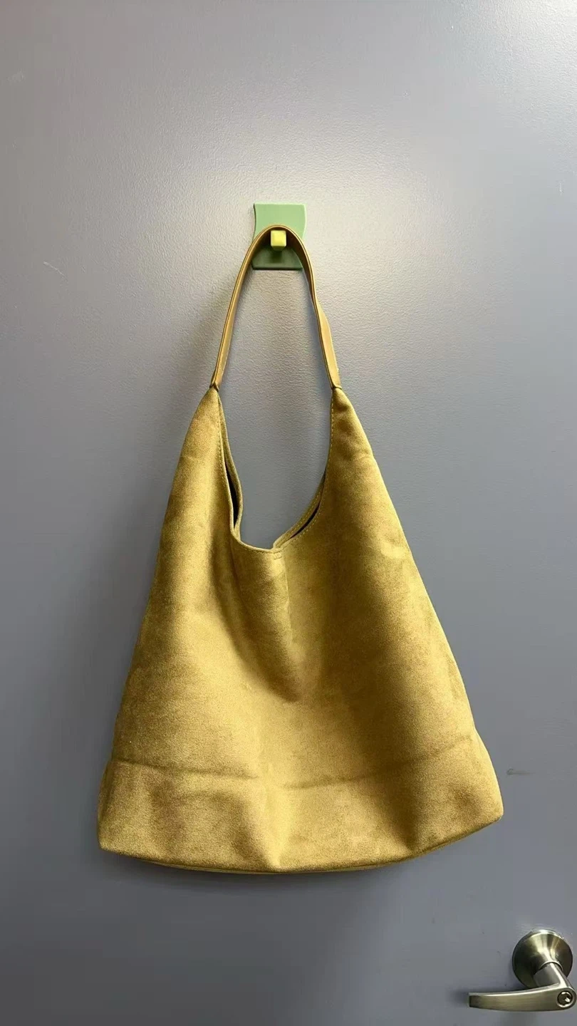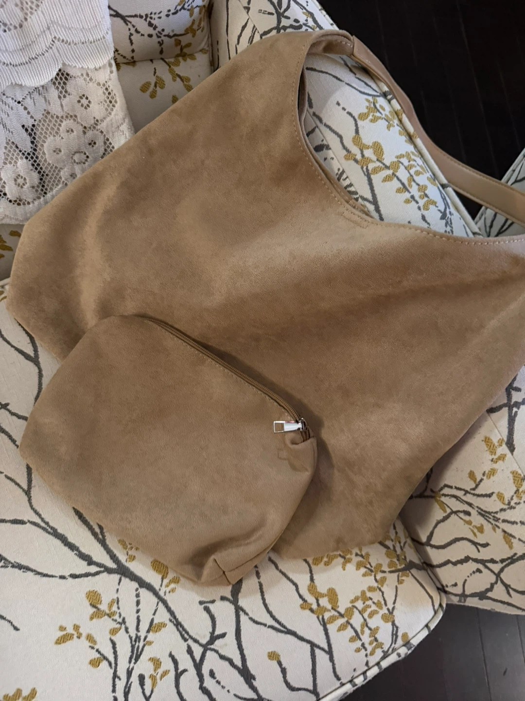 - Made of soft suede material with a leather-trimmed shoulder strap. Simple and relaxed style, ample capacity to meet daily commuting needs.
