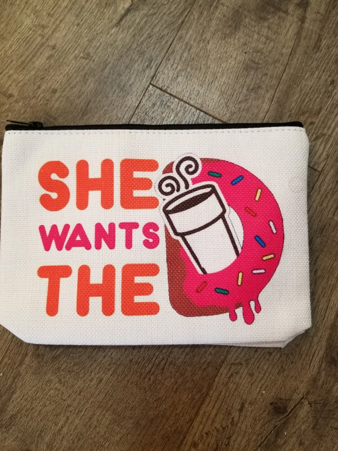 White canvas makeup bag with a funny "She Wants The D" graphic featuring a donut and coffee cup. It's perfect for storing your makeup or small essentials. This pouch is great for travel or everyday use! Brand new