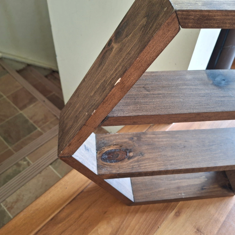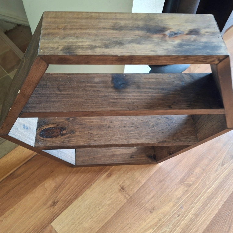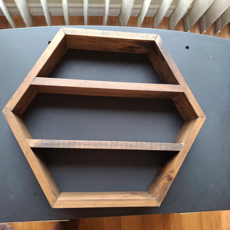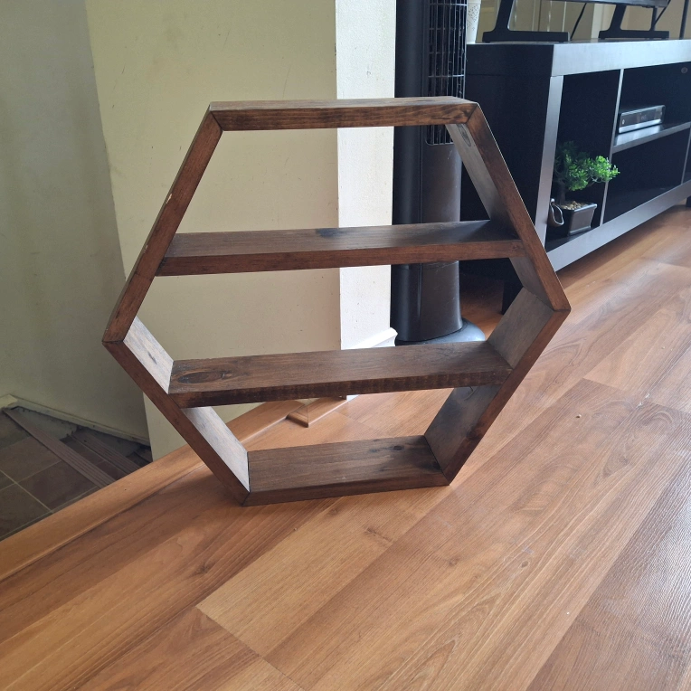 Hexagon-shaped shelf. Made of wood. Dark stain finish. The shelves provide ample space for displaying your favorite items.