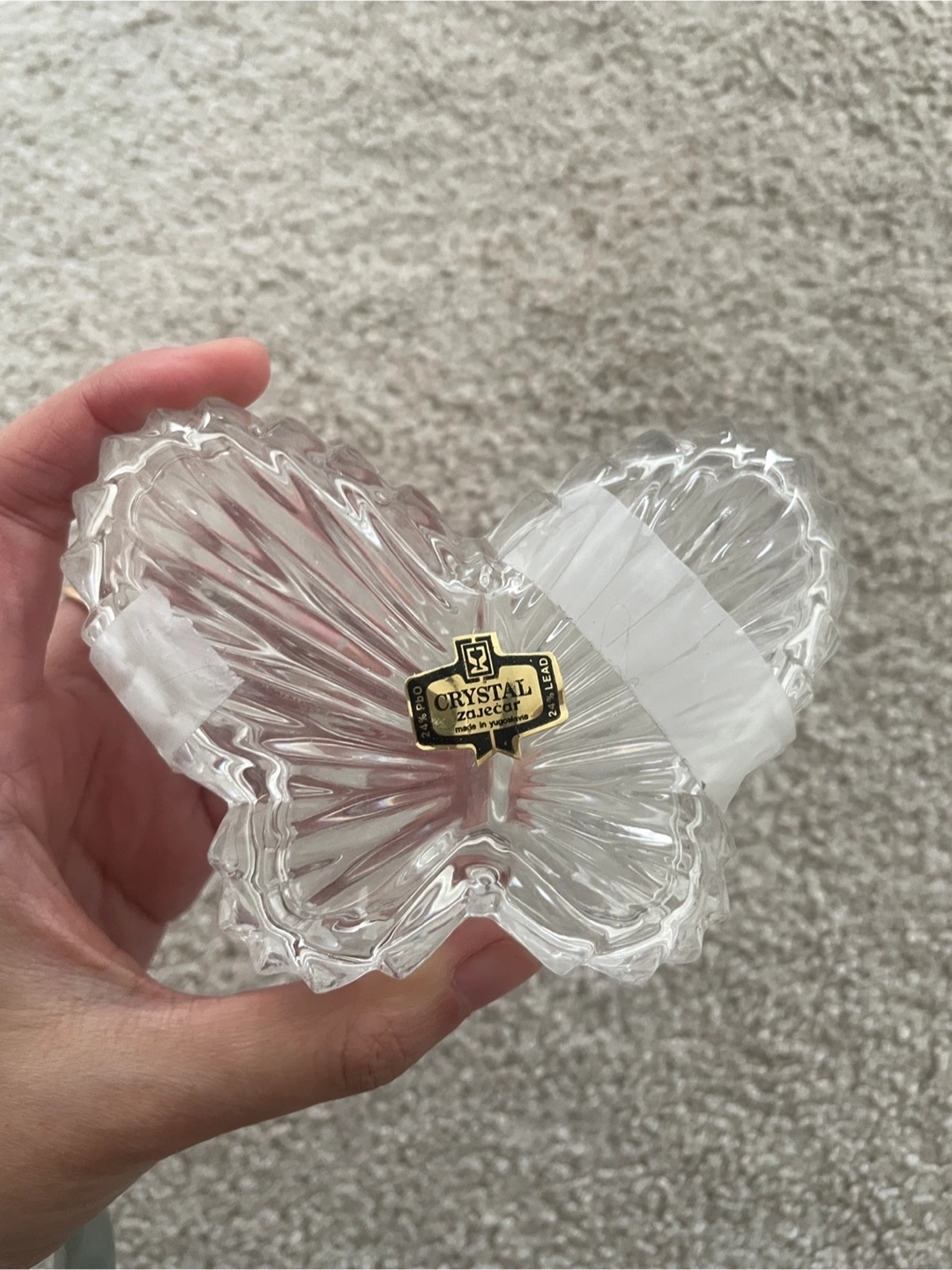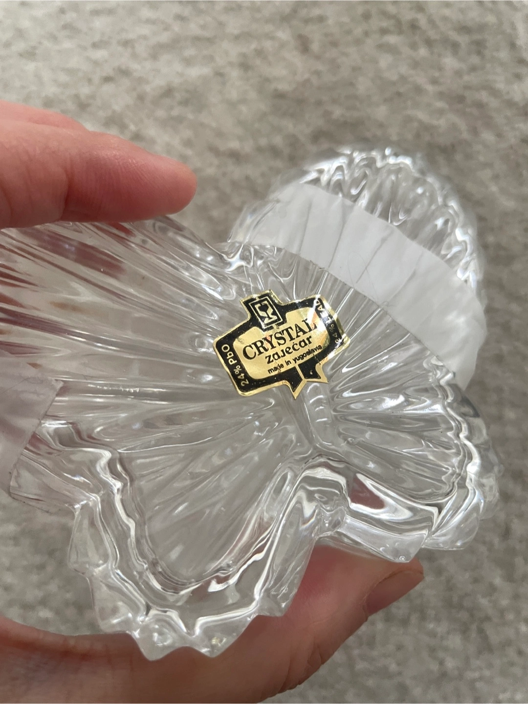 This is a Crystal Zajecar dish. It's made with 24% lead crystal. It's heart-shaped and would be lovely for holding small trinkets or as a decorative piece.