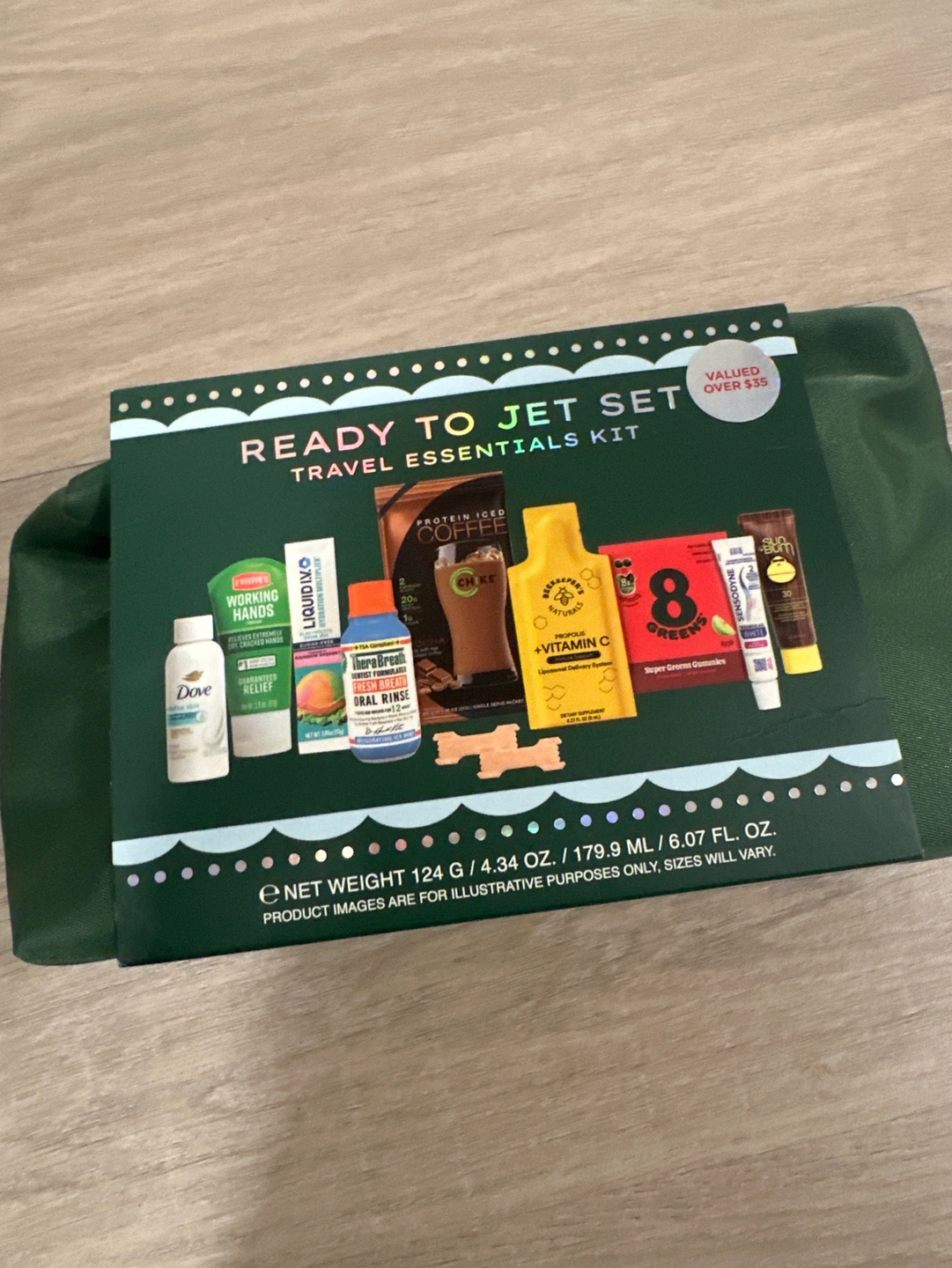 This travel essentials kit includes a variety of personal care items. It contains products like Dove hand relief, Liquid IV, TheraBreath oral rinse, and Sun Bum sunscreen. The net weight is 124g or 4.34 oz.