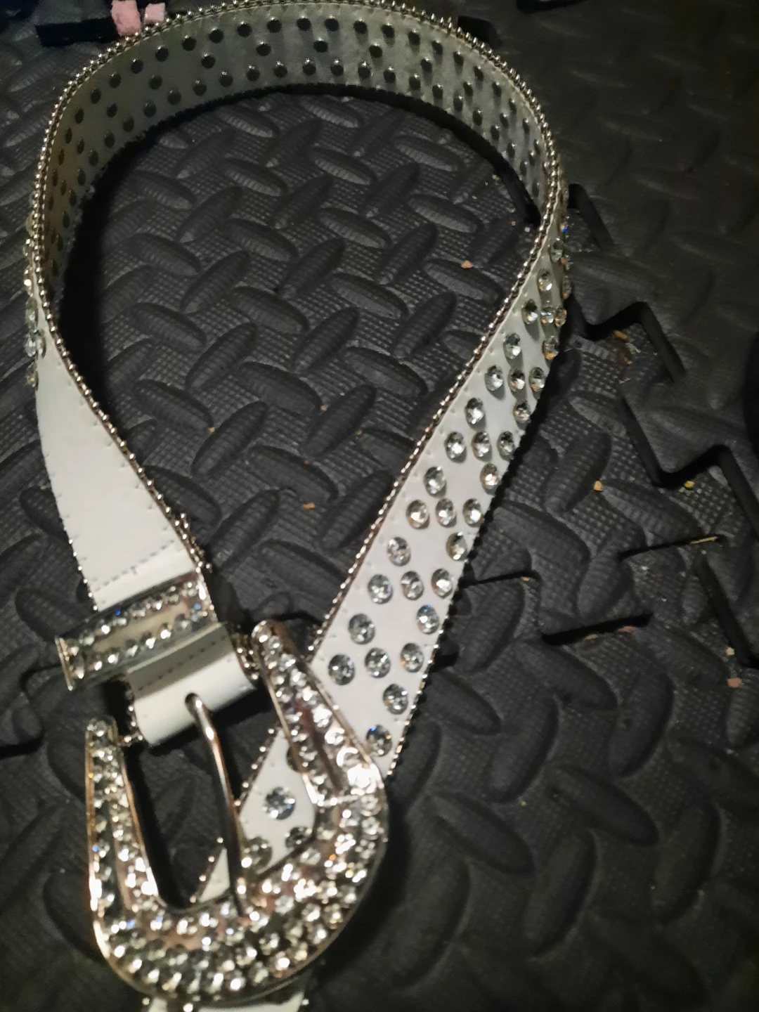 Stylish white belt adorned with numerous rhinestones and a large, sparkling silver buckle. It's made of faux leather and features an adjustable strap. This belt adds a bold statement to any outfit!