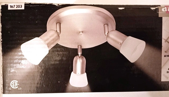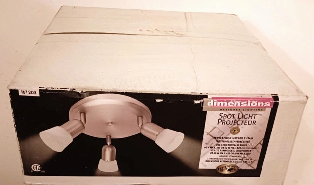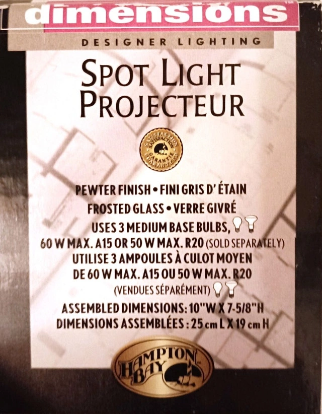 Unopened Hampton Bay Dimensions designer lighting spotlights (3) in a pewter finish with frosted glass on a round base. Assembled dimensions 10" W X 7 5/8"H. Flushmount kit with instructions included. Box is a bit dusty from storage. Available at a safe, public meet-up in downtown Kitchener.