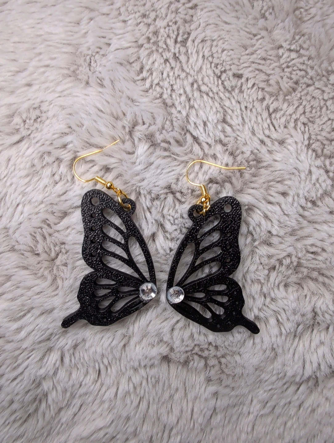 These black butterfly earrings feature intricate cutouts and a sparkling rhinestone accent. The hooks are gold-toned. They'd make a fun accessory for any occasion!