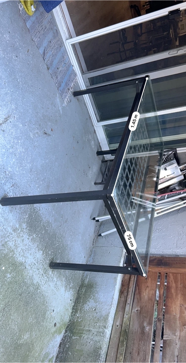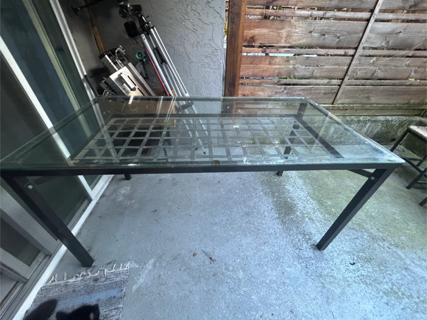 Selling a glass top dining table with a sturdy metal frame. The table dimensions are approximately 1.45m in length and 75cm in width. Also included are 4 matching chairs. Perfect for outside area!