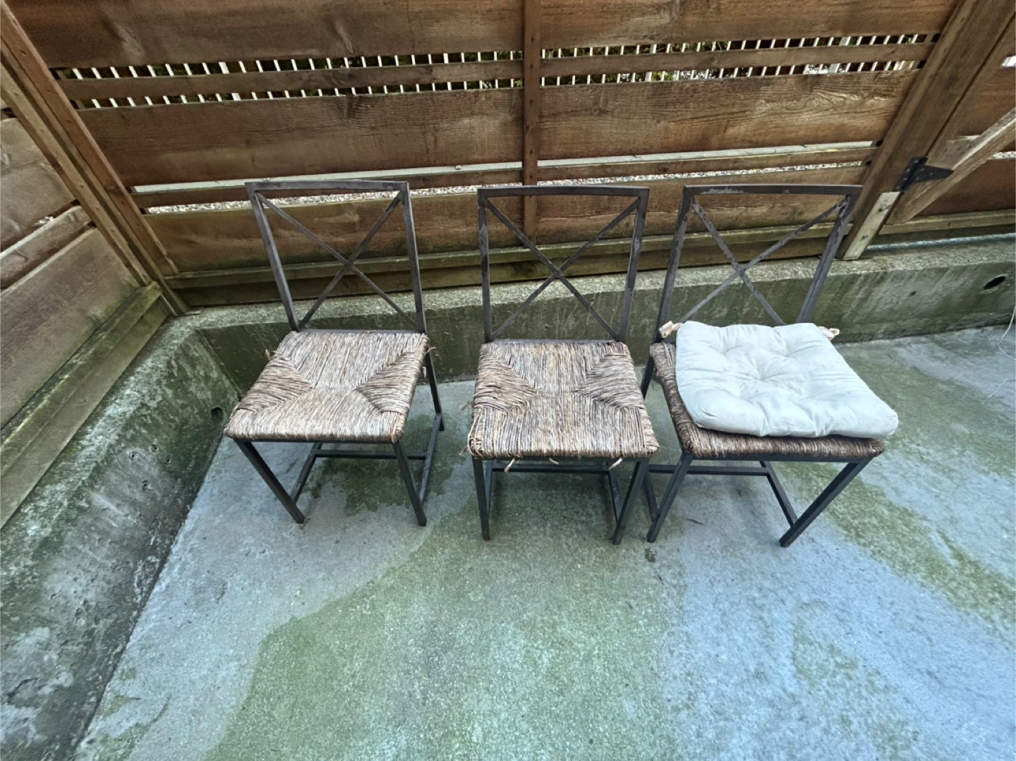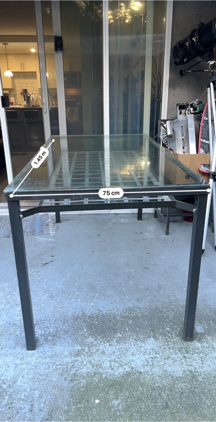Selling a glass top dining table with a sturdy metal frame. The table dimensions are approximately 1.45m in length and 75cm in width. Also included are 4 matching chairs. Perfect for outside area!
