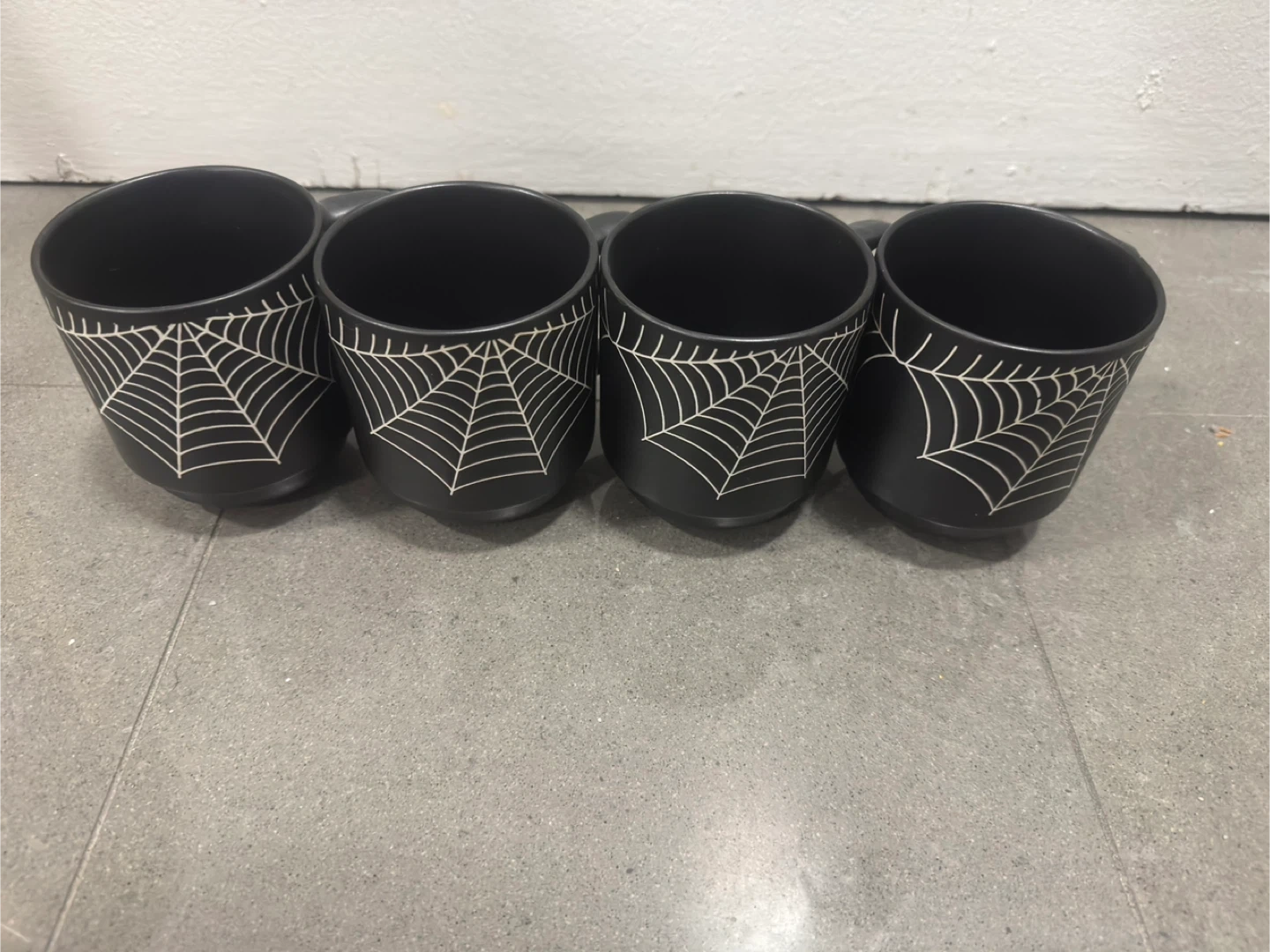Selling a set of 4 Spiderwebs stackable glazed mugs. Perfect for Halloween or for some unique home decor. They are in like-new condition.