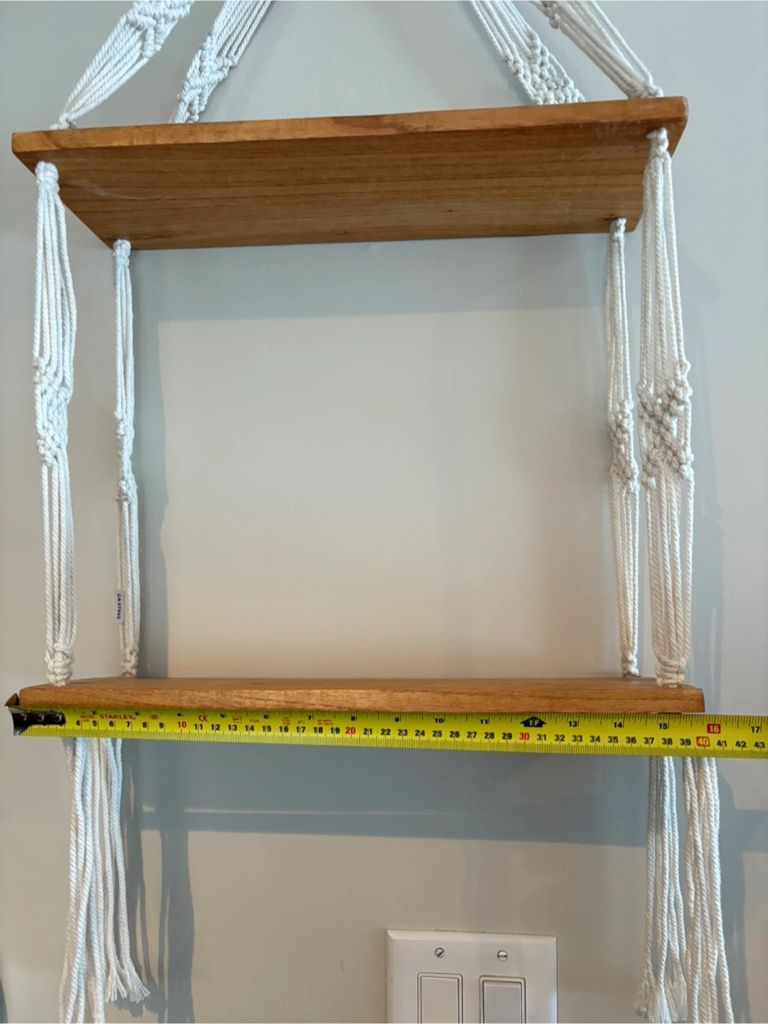 This macrame shelf features two wooden tiers suspended by a white rope hanger. It's perfect for displaying plants or small decor items. The approximate shelf width is 16 inches.