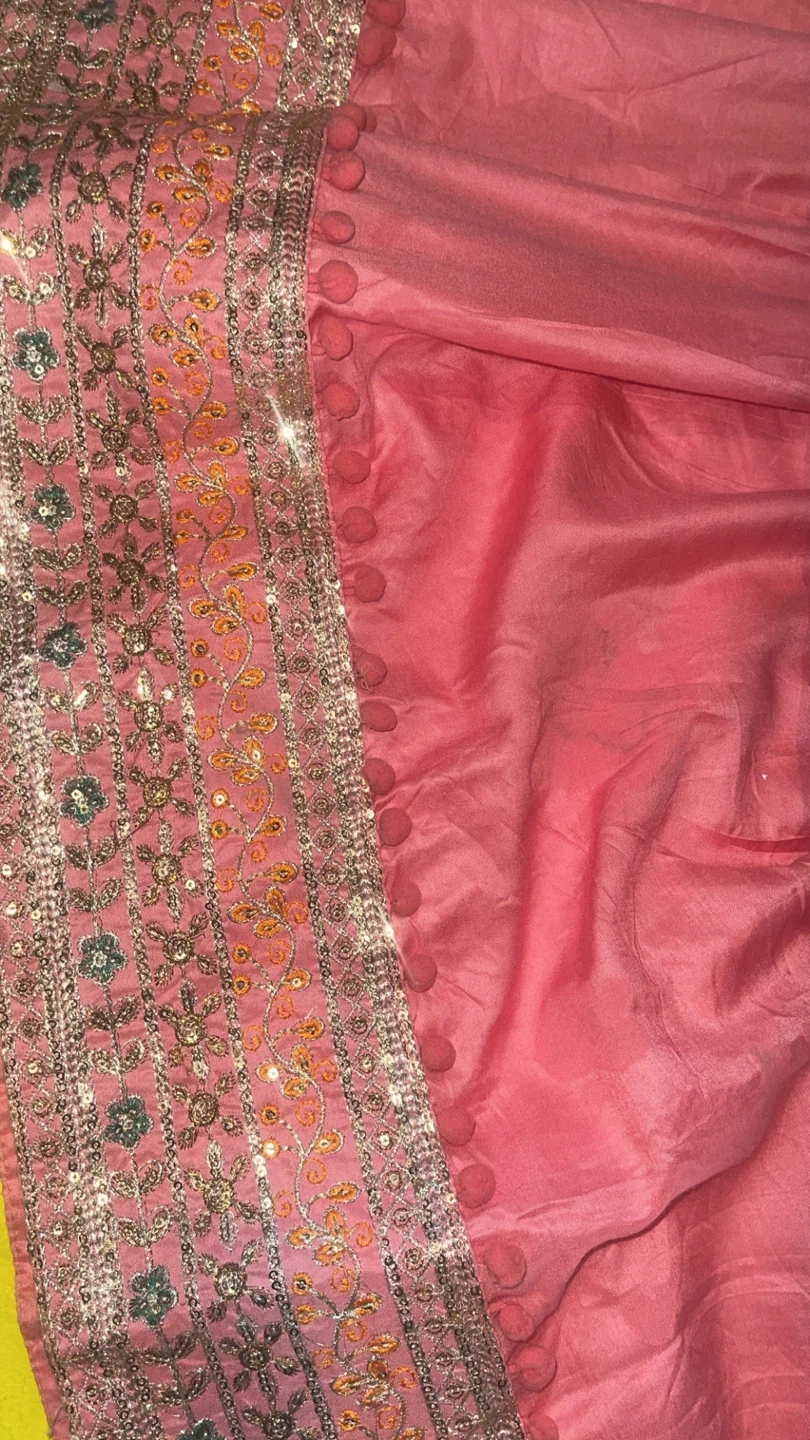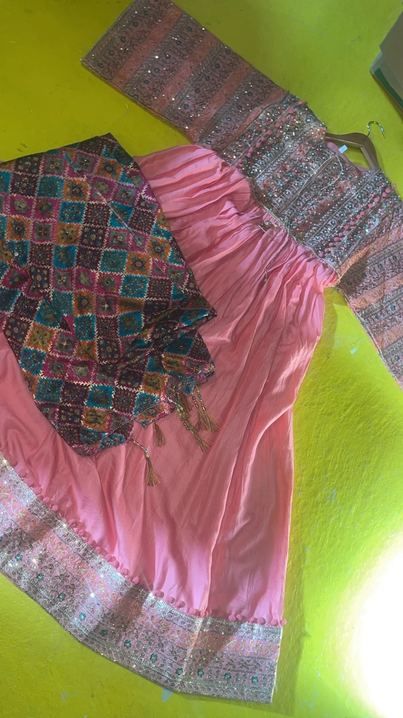 This beautiful pink kurti set features intricate embroidery and sequins on the bodice and sleeves. It's paired with a flowy pink skirt and a colourful printed dupatta with tassels. Perfect for festive occasions!