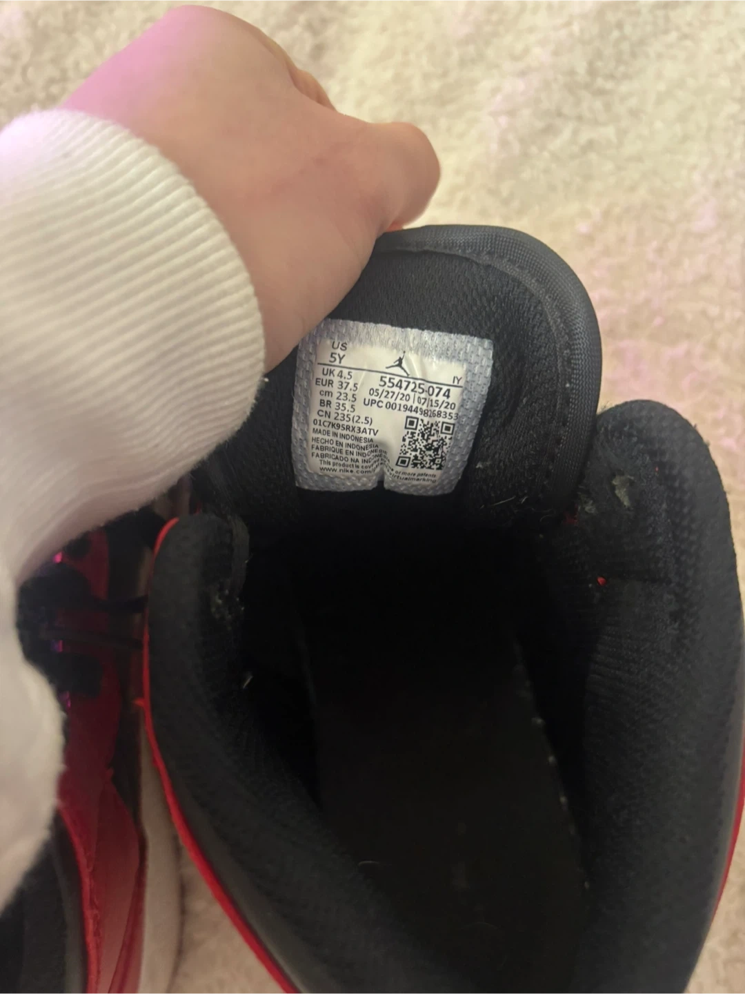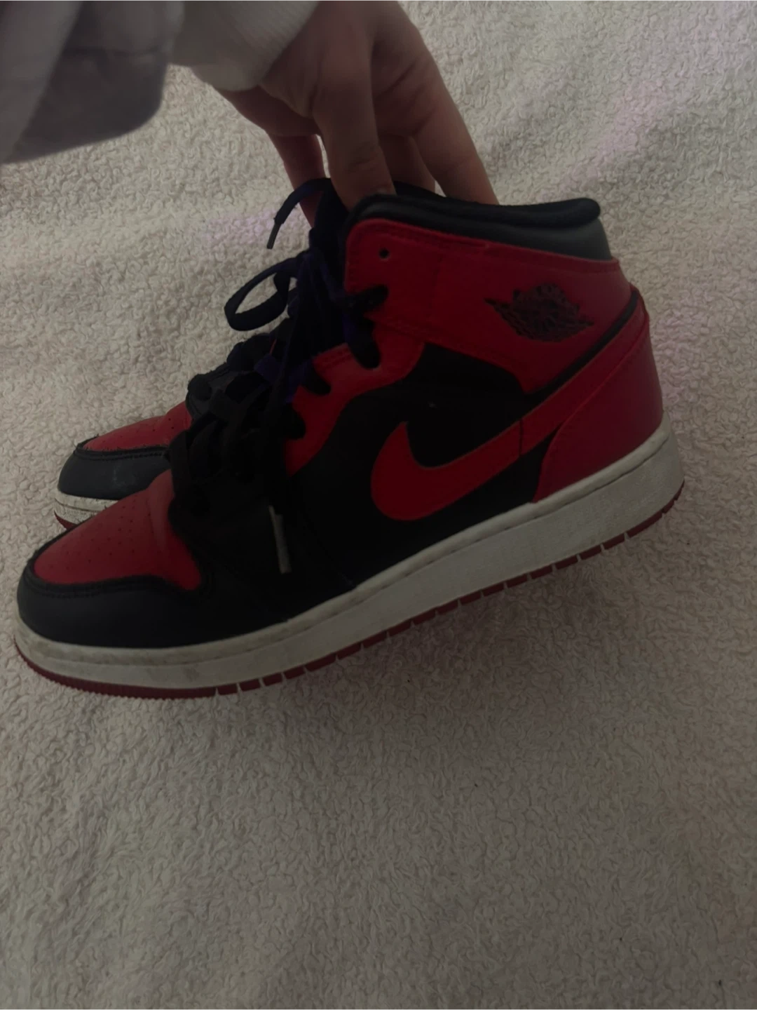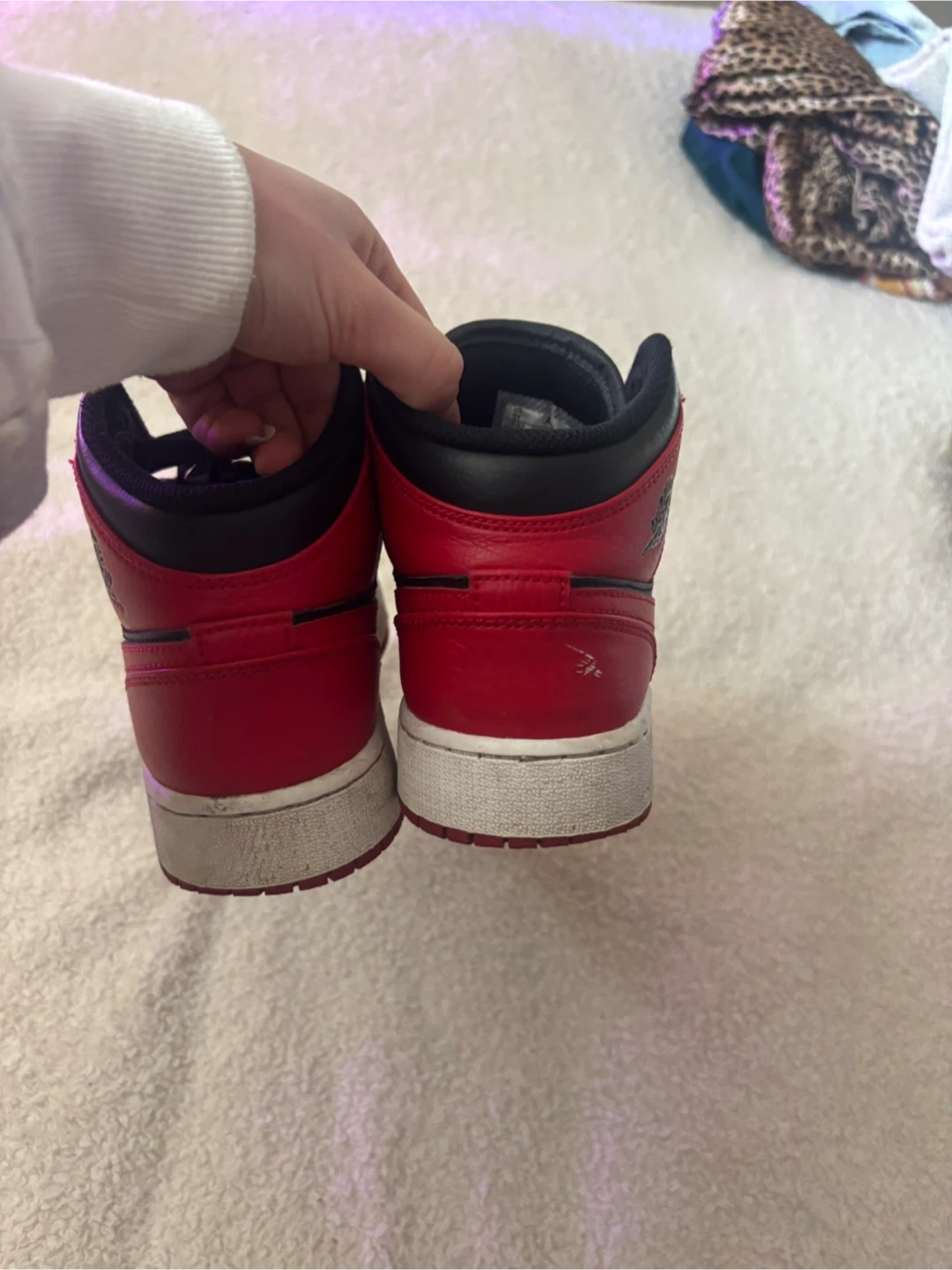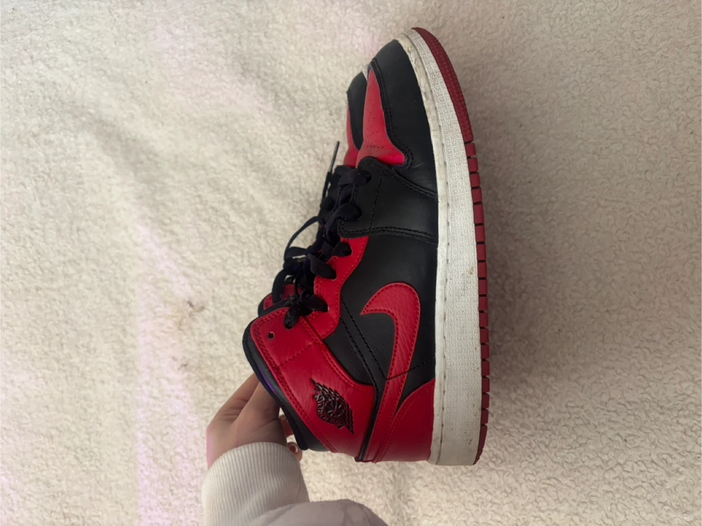 Black and red Air Jordan 1 Mid sneakers. US size 5. Leather upper with rubber sole. Also fits women size 7- 8 1/2.