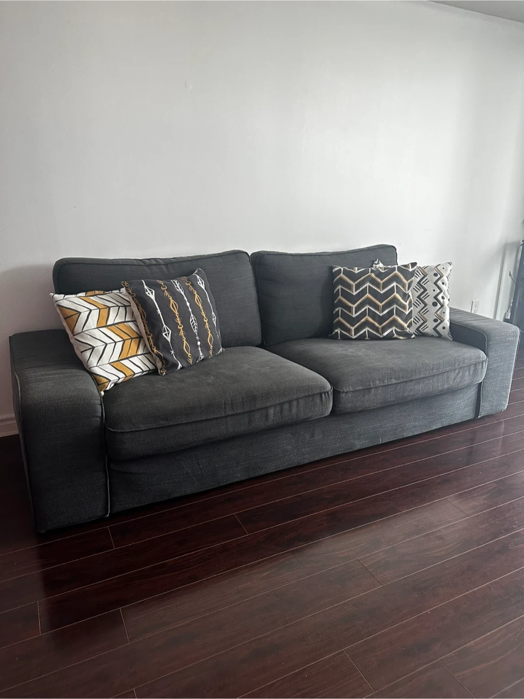Selling a comfy IKEA Kivik 2-seat sectional sofa in grey! It's in great shape and ready for a new living room. The Kivik series is known for its deep, low seating and soft cushions, perfect for relaxing. The covers are removable and washable, making it easy to keep clean. Pillows are included with our favourite covers!