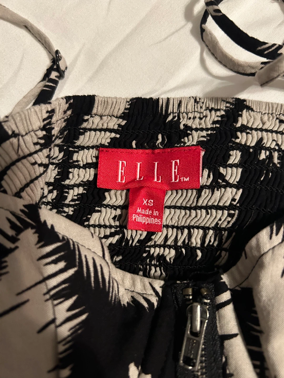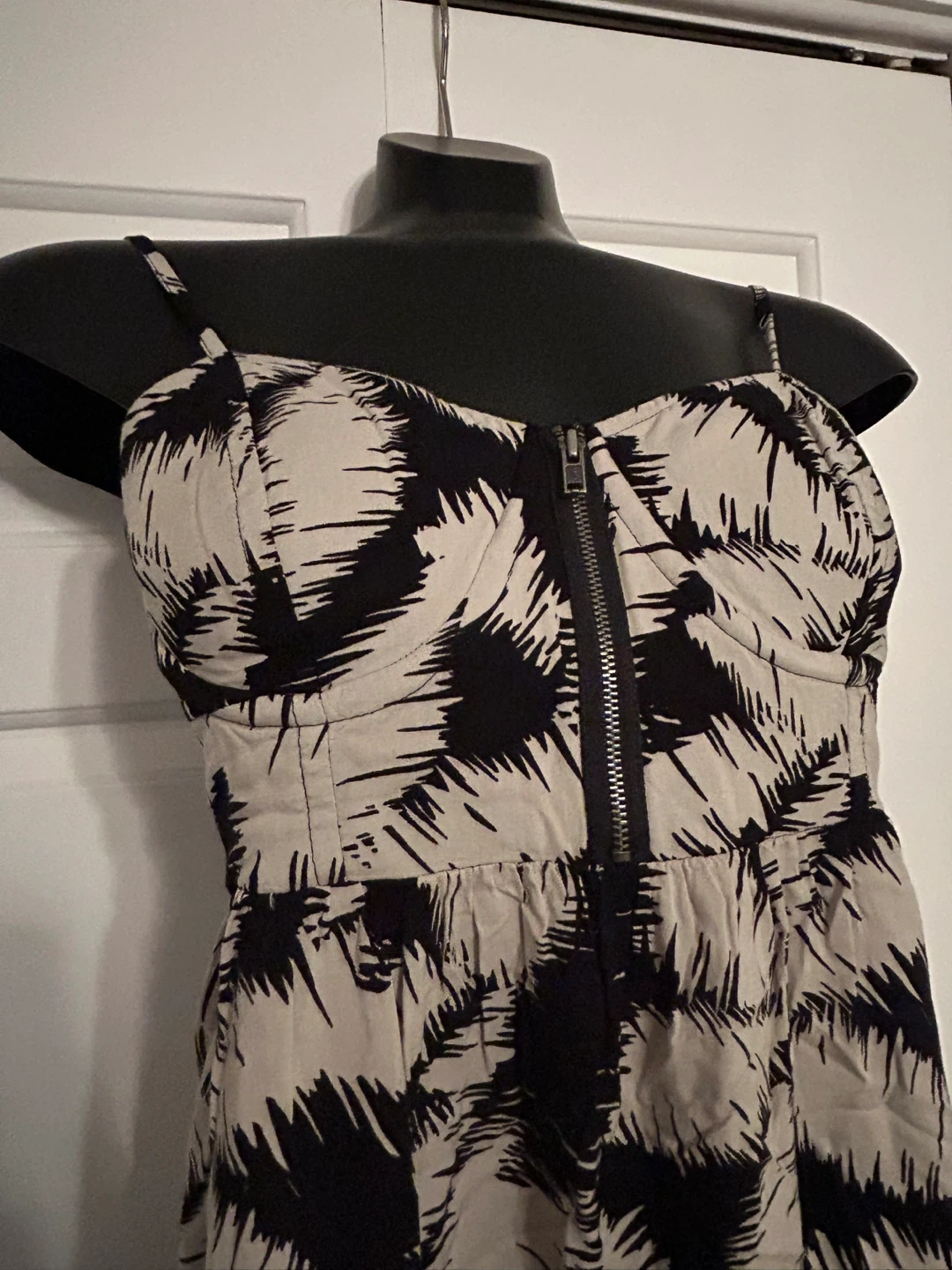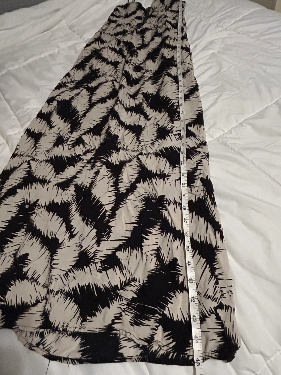 It has pockets! Maxi dress with black and cream leaf pattern. Features a flattering silhouette - corset top with front zipper, ruched elastic in back, and adjustable shoulder straps. Size XS measurements in photos.