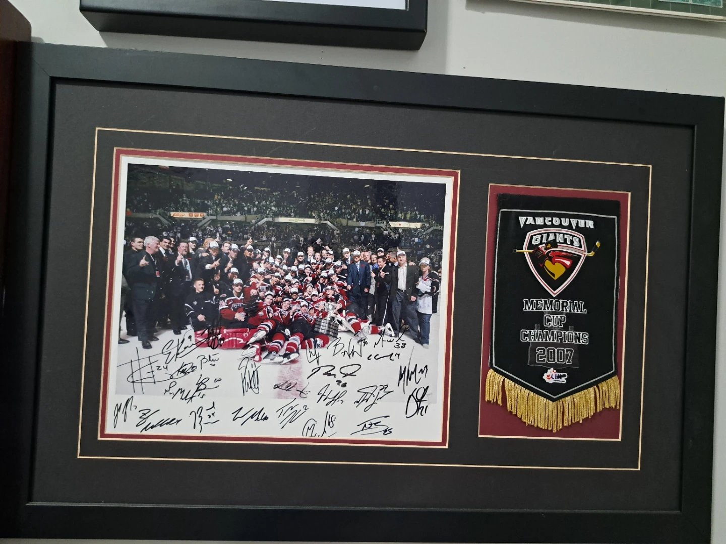 Selling a framed picture commemorating the Vancouver Giants' Memorial Cup Championship in 2007. It features a team photo with signatures and a commemorative banner. Great for any hockey fan!