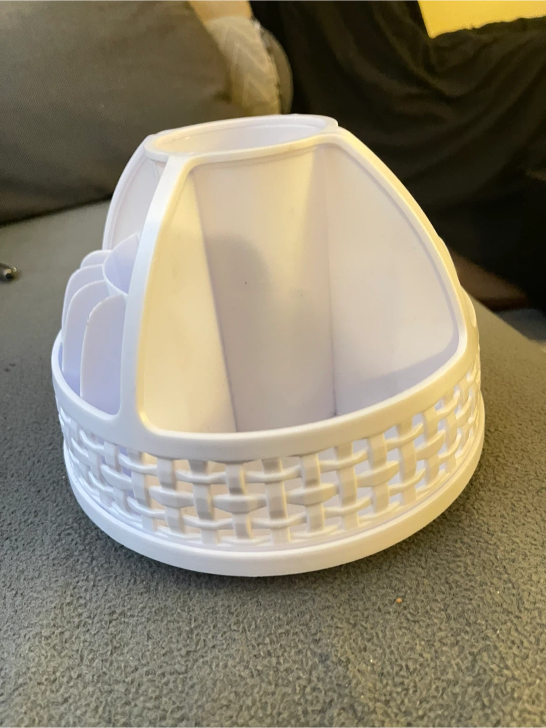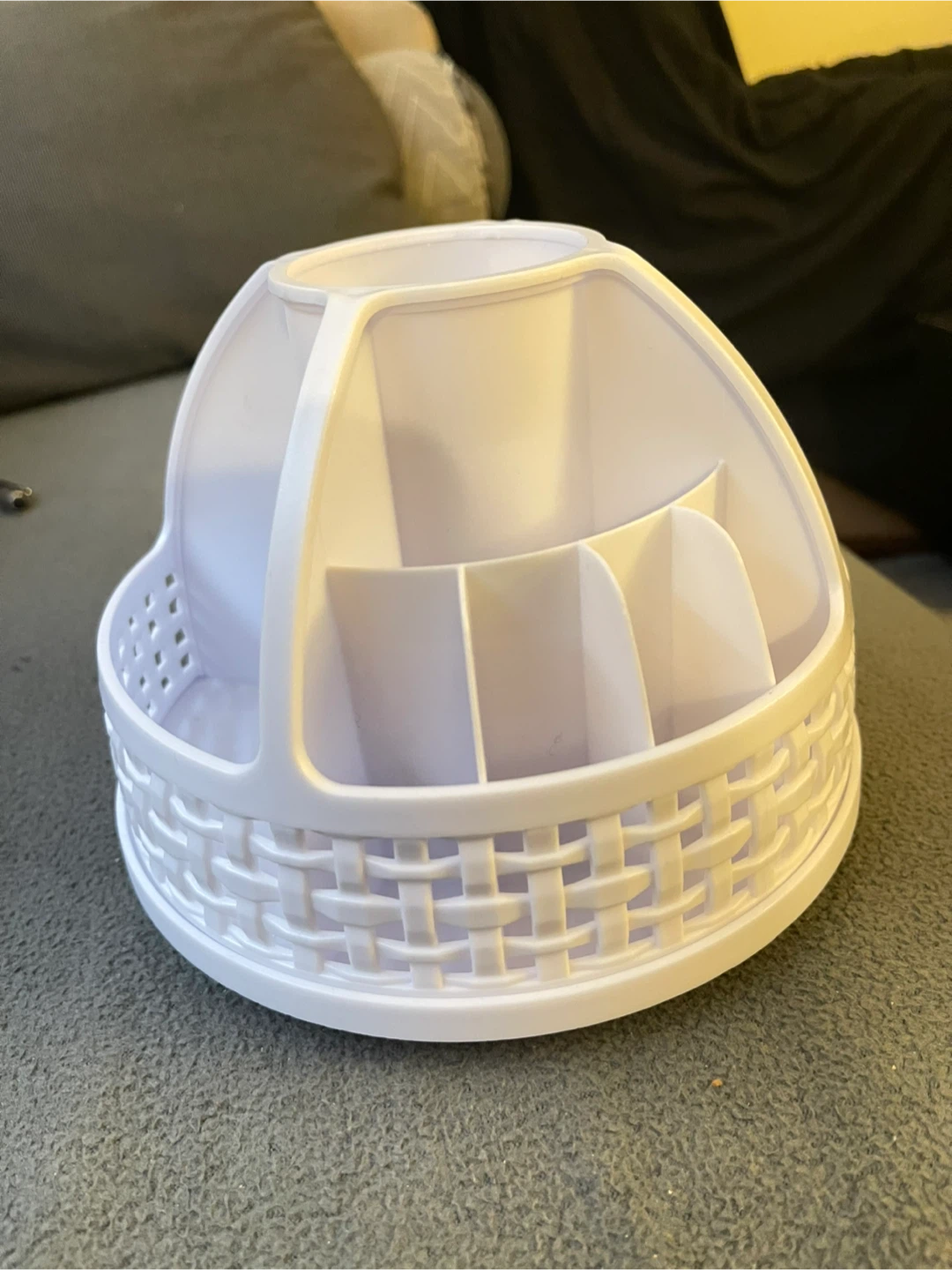 This white rotating desk organizer caddy has multiple compartments for pens, pencils, and other supplies. It features a basket-weave design around the base. Great for keeping your workspace tidy!