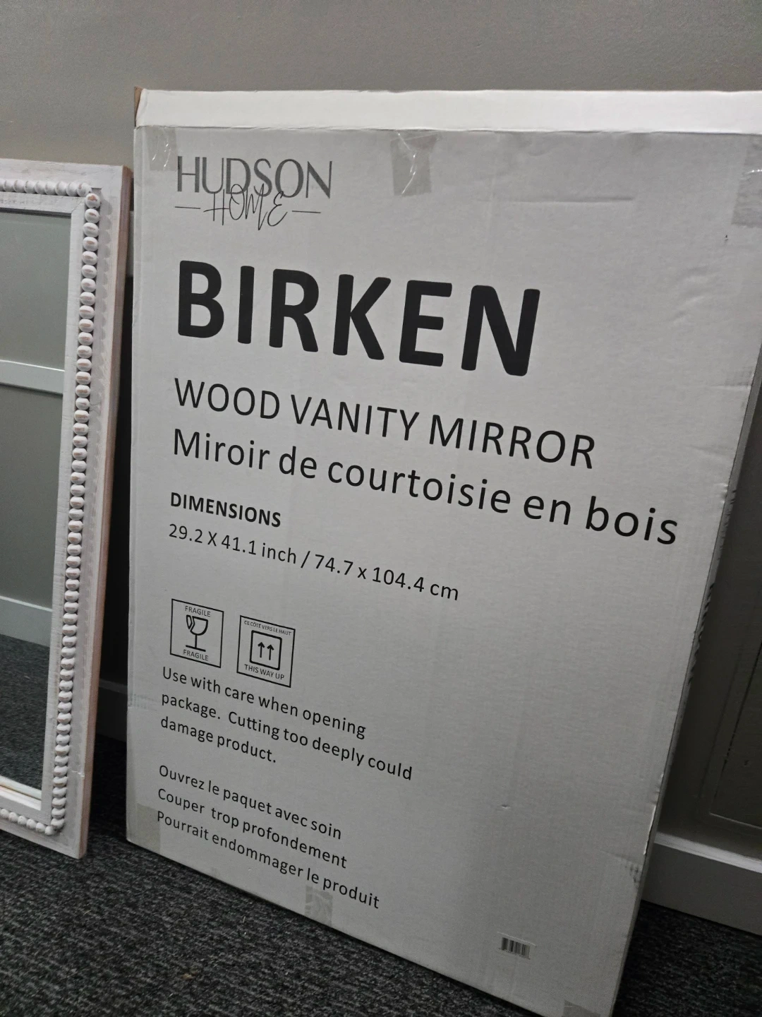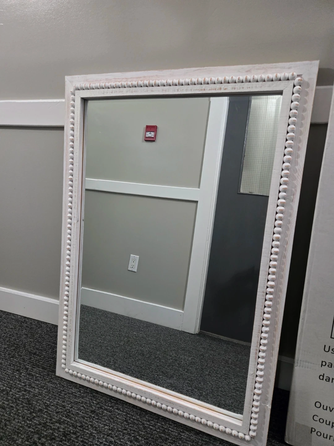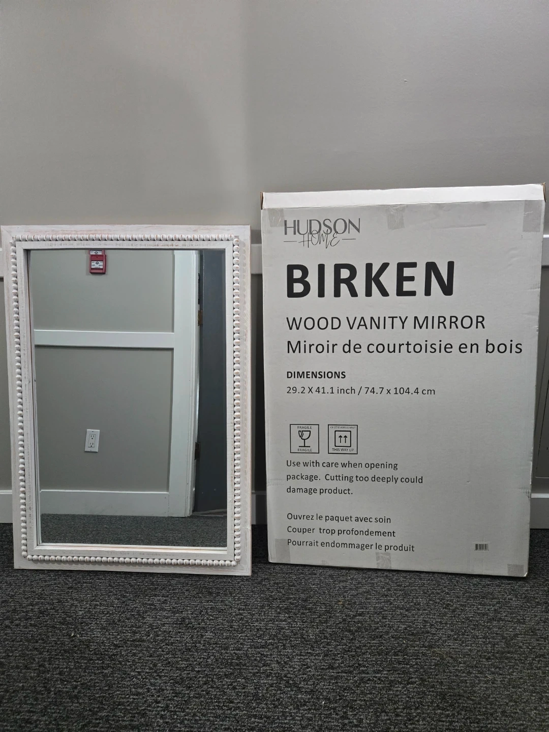 This is a Hudson Home Birken Wood Vanity Mirror. It has a white beaded frame and dimensions of 29.2 x 41.1 inches (74.7 x 104.4 cm). It would add a decorative touch to any room!