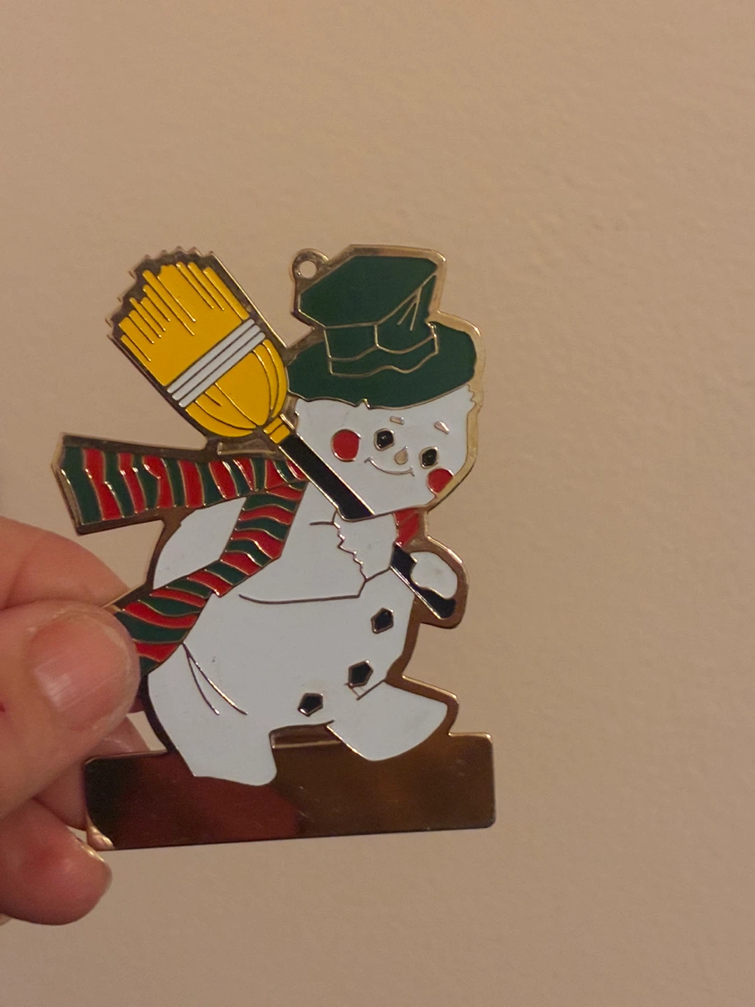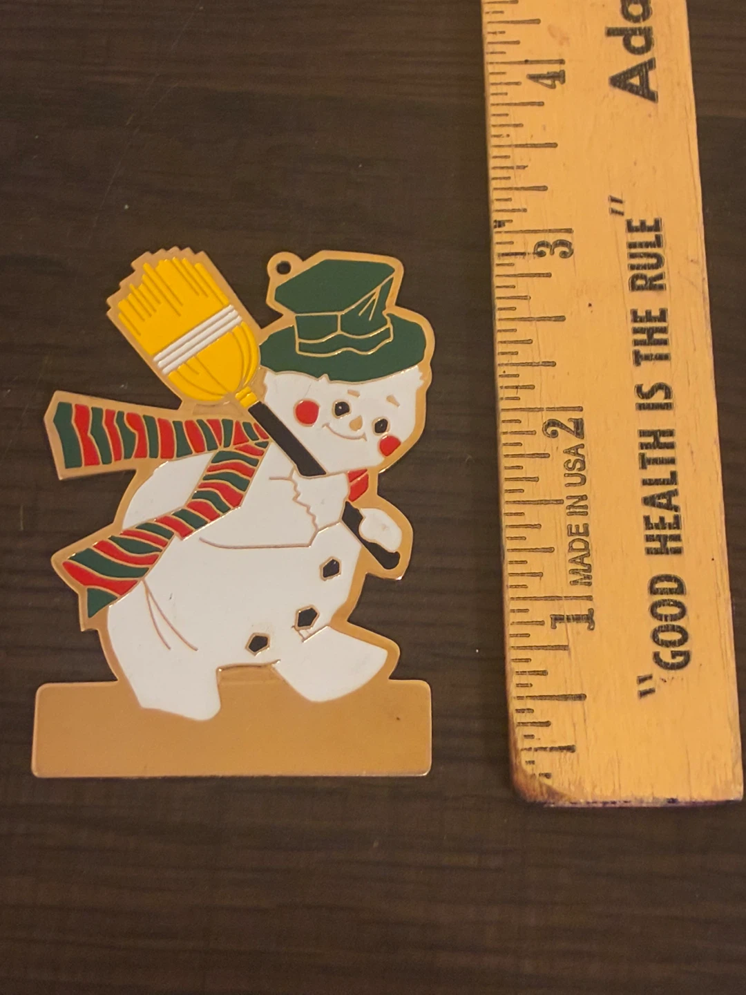 Selling a cute snowman Christmas ornament! It's in great shape and ready to add some holiday cheer to your home. It has a green hat, a red and green scarf, and a yellow broom. Perfect for your Christmas tree or as a festive decoration!