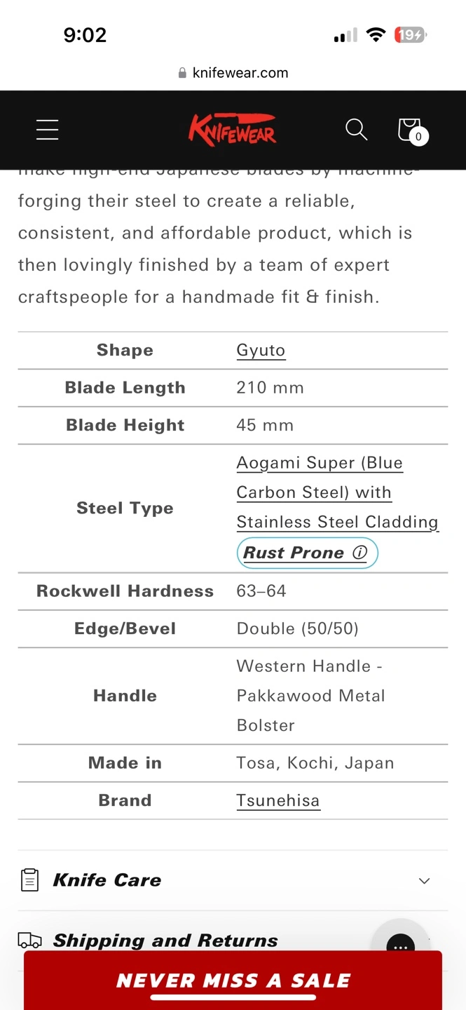 I used this knife twice. Well balanced, Super sharp, no rust, already sharpened using super famous brand #2000 Japanese shapton sharpening stone.