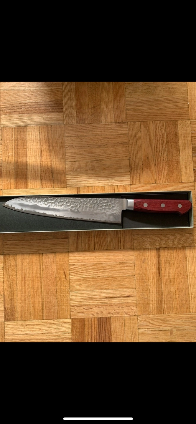 This is a Japanese chef's blue #2 carbon steel knife with a hammered by hand and a wooden handle. It is in an original box. Very beautiful shape. Size is 8inches.
