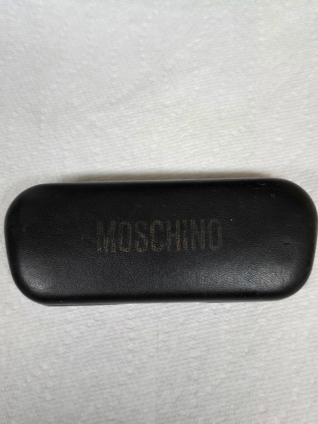 Black hard shell eyeglass case with Moschino logo inside. It's a sturdy case for protecting your glasses. This case would be useful for anyone who owns a pair of Moschino or other brand eyeglasses.