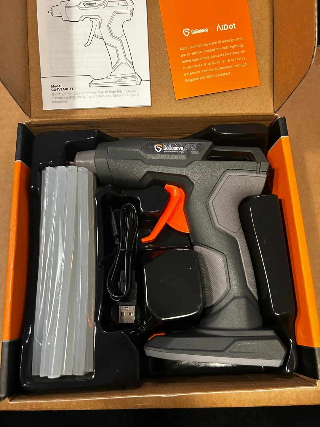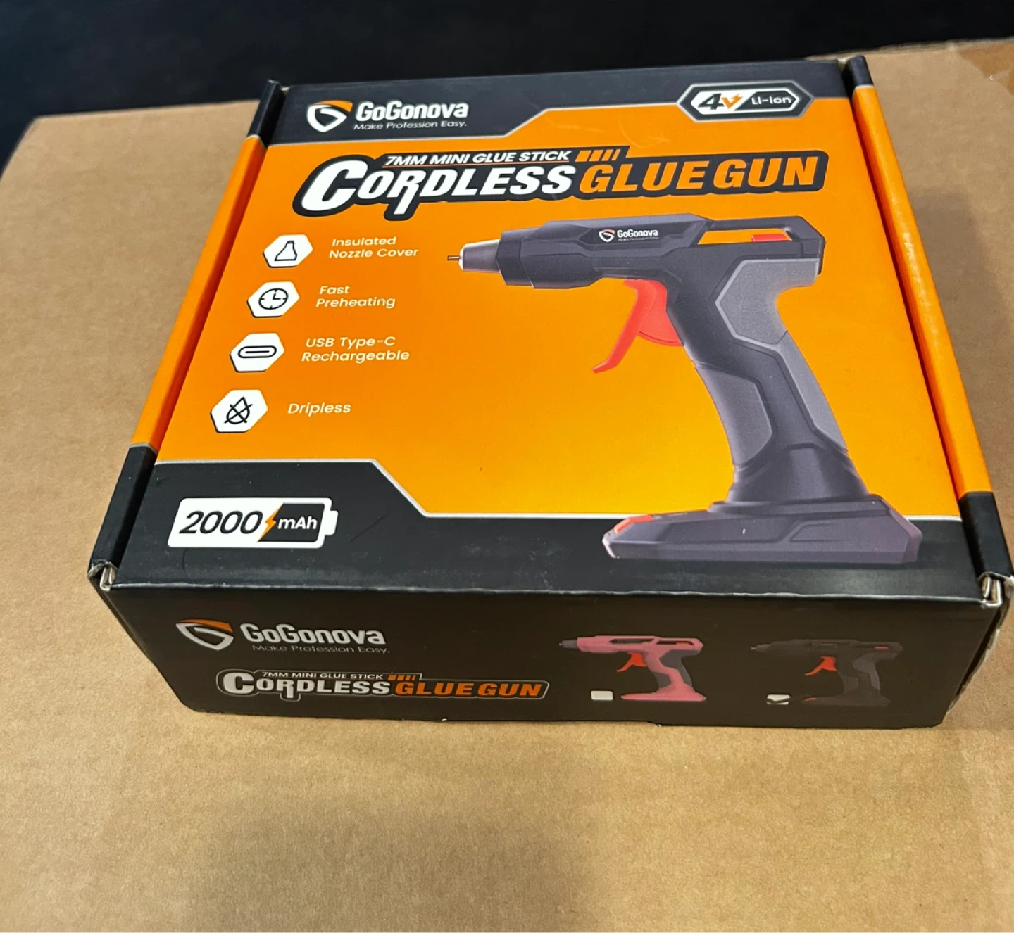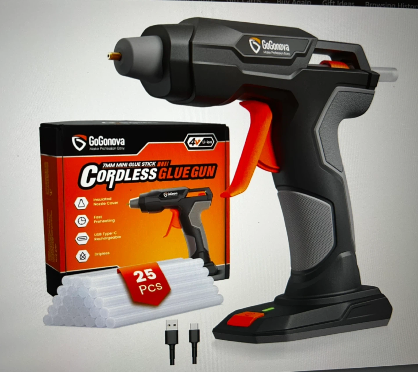 This cordless glue gun is USB Type-C rechargeable and features fast preheating. It includes glue sticks. It's designed for dripless application.