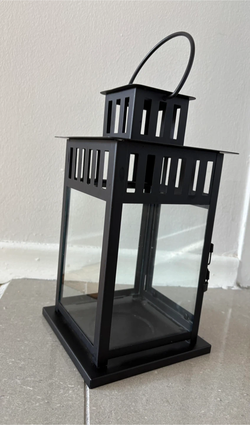 A stylish black metal lantern with glass panels. It's suitable for indoor or outdoor use. This lantern creates a lovely ambiance with a candle inside!