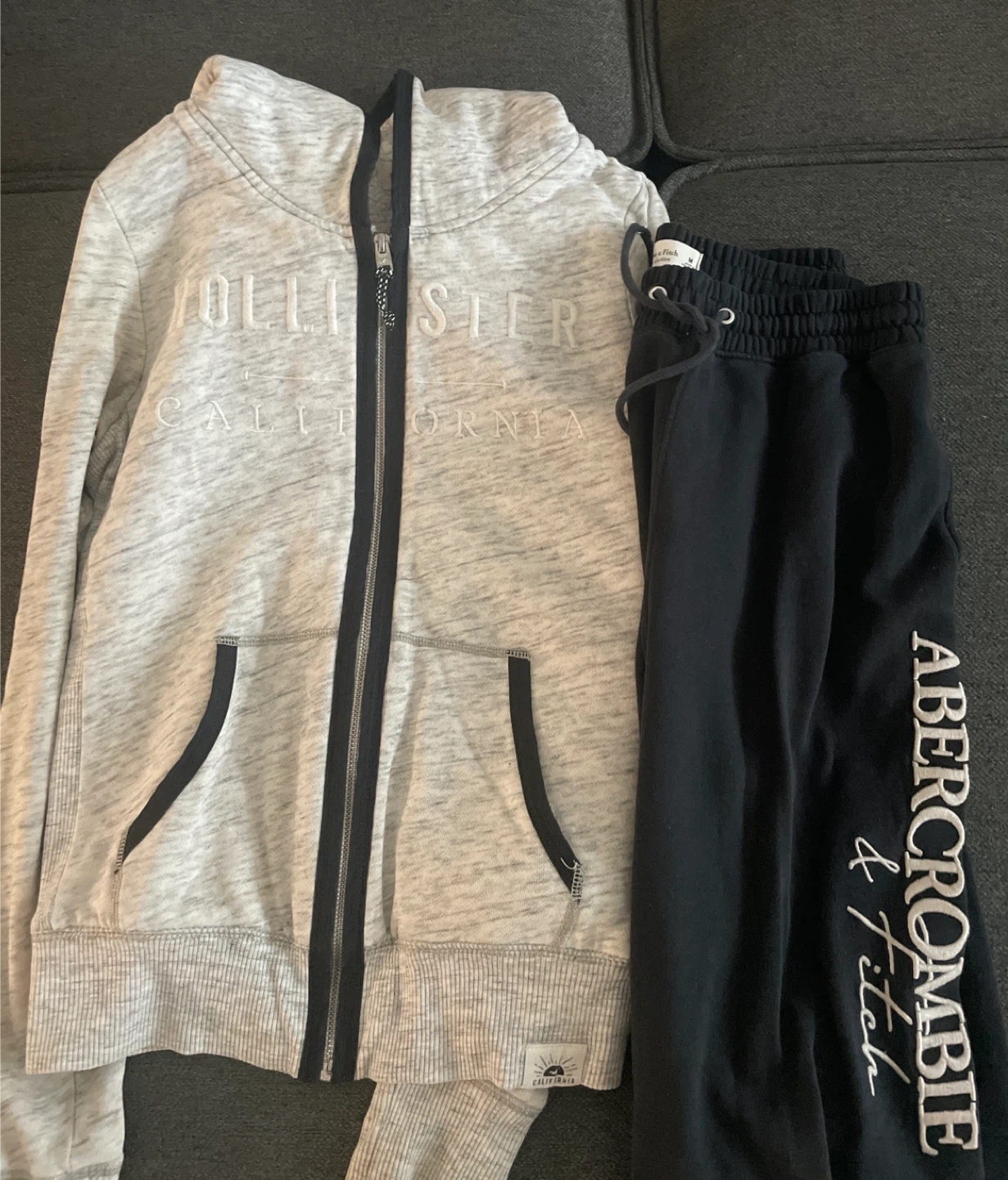 This is a set featuring a grey marled zip-up hoodie from Hollister with "California" embroidered on the front. It also includes a pair of black sweatpants from Abercrombie & Fitch with the brand name down the leg. Both pieces are soft and comfortable for casual wear.