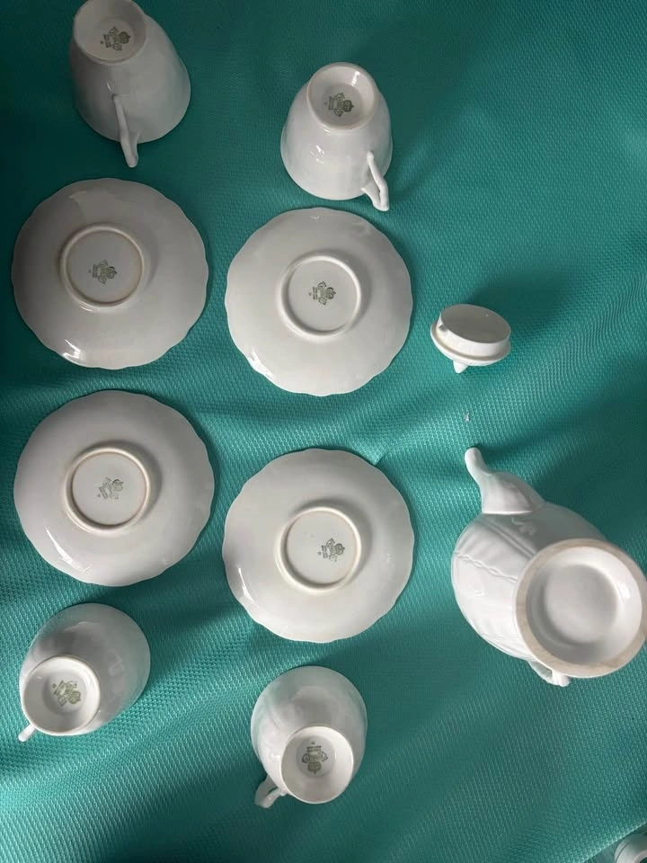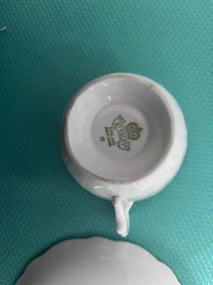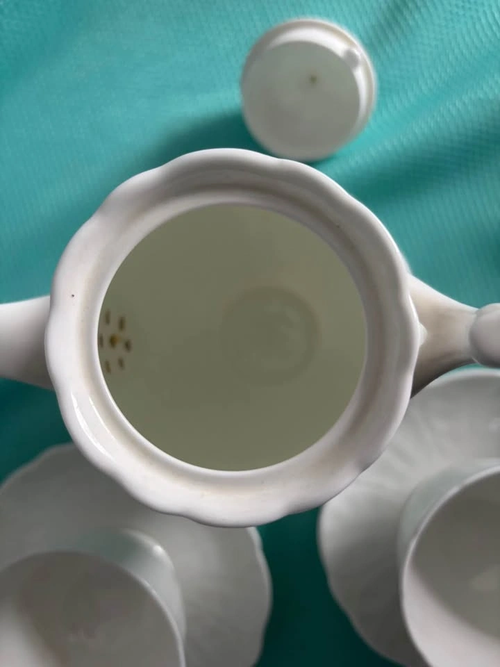Aynsley white crocus teapot with 4 teacups and saucers. Teapot is missing its stamp and there is a hairline crack in one of the cups (circled in picture 3). Pick up in Keswick.
