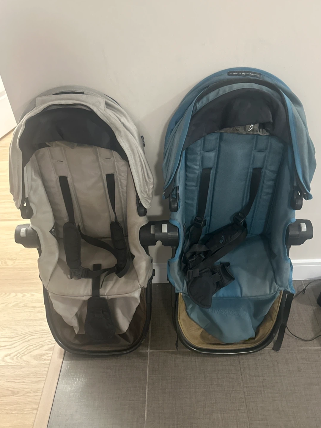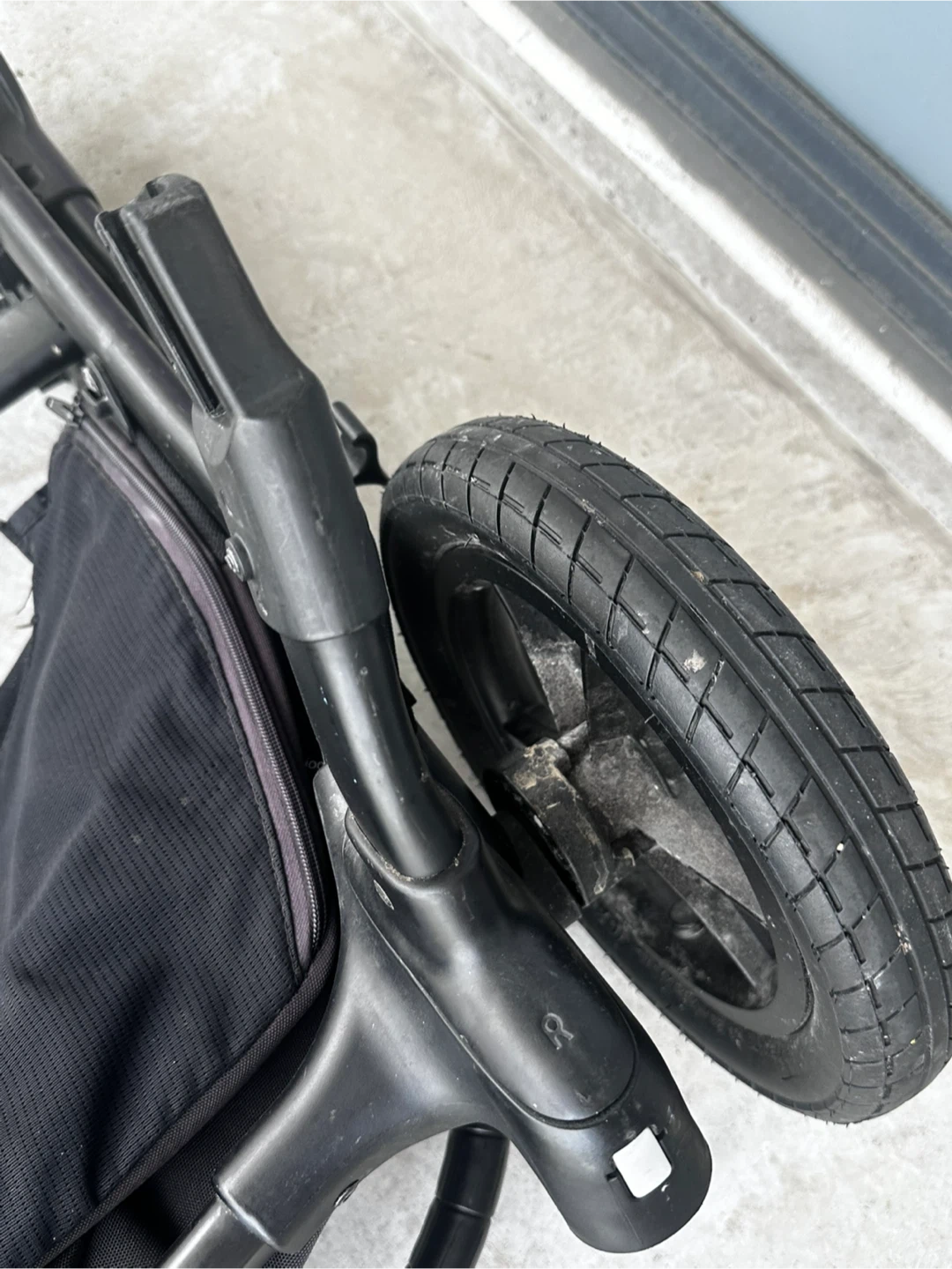 One front wheel is missing (we took it as a replacement for our other stroller). You can either use it for parts or would need to buy 1 front wheel.