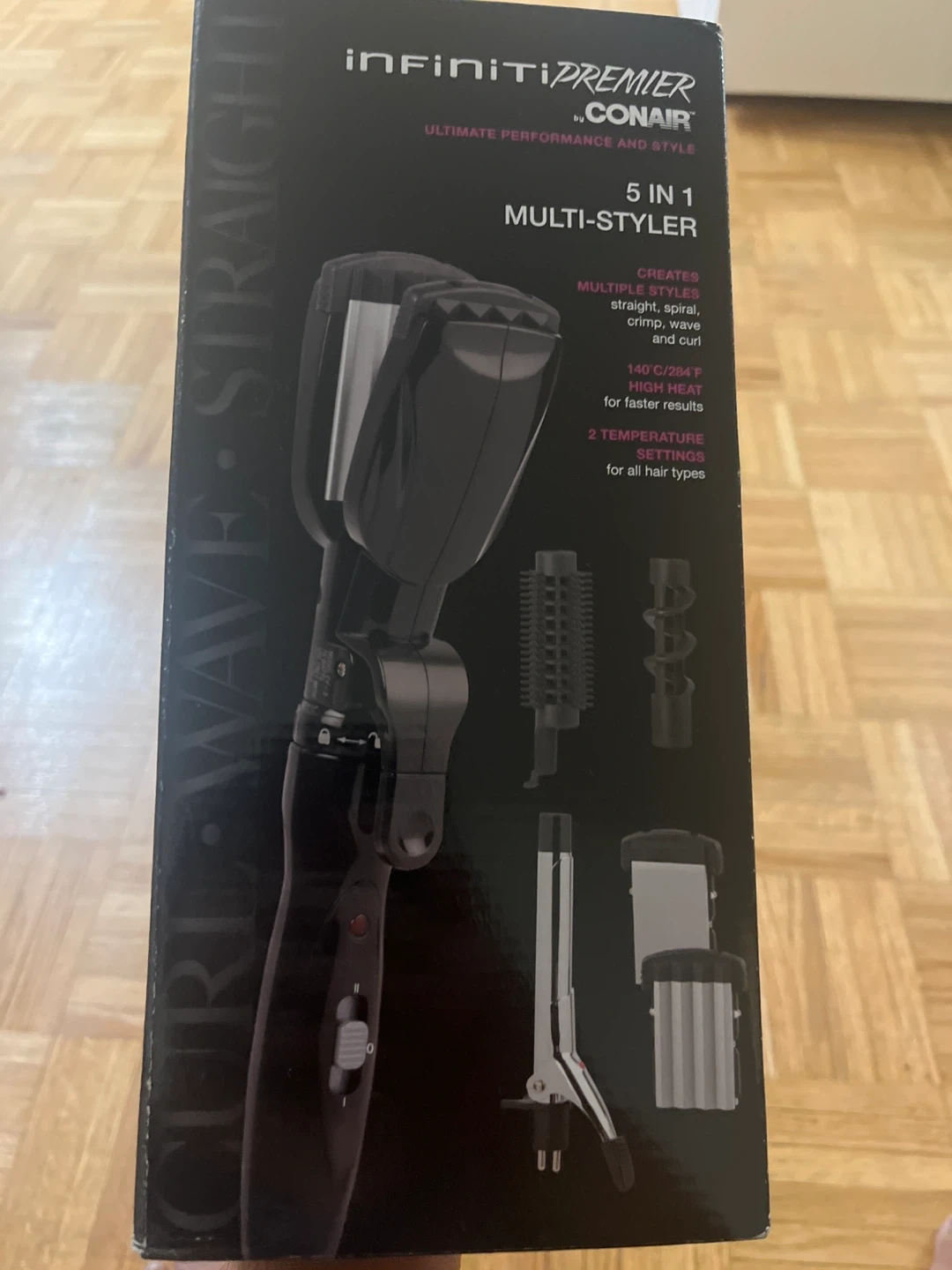 Selling a Conair InfinitiPRO Premier 5-in-1 Multi-Styler! It creates multiple looks: straight, spiral, crimp, wave and curl. It has two temperature settings for all hair types and 140°C/285°F high heat for faster results. The box is included!