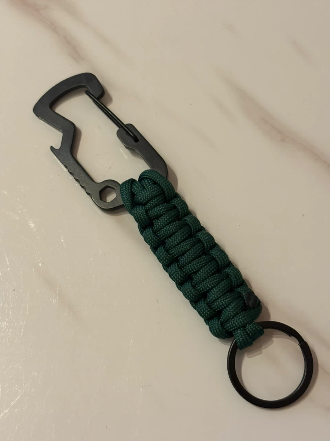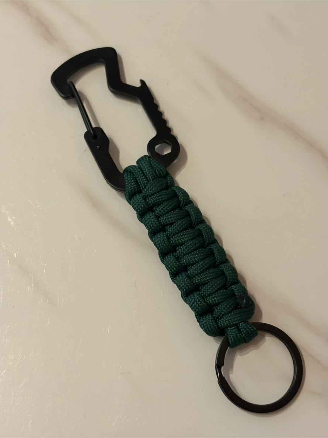 Two keychain multi-tools featuring carabiner clips and paracord wraps. One is black, the other is forest green. Each includes a bottle opener and hex wrench. Handy for camping or everyday carry!