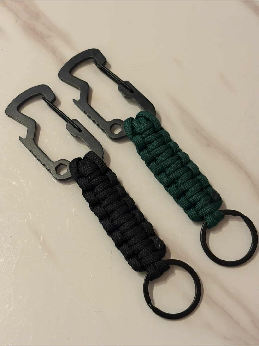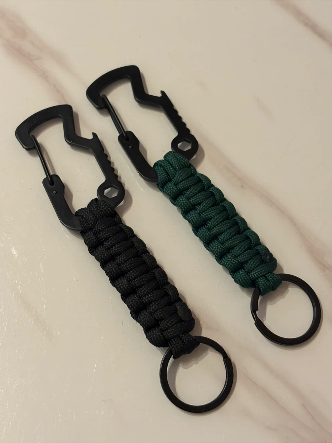 Two keychain multi-tools featuring carabiner clips and paracord wraps. One is black, the other is forest green. Each includes a bottle opener and hex wrench. Handy for camping or everyday carry!