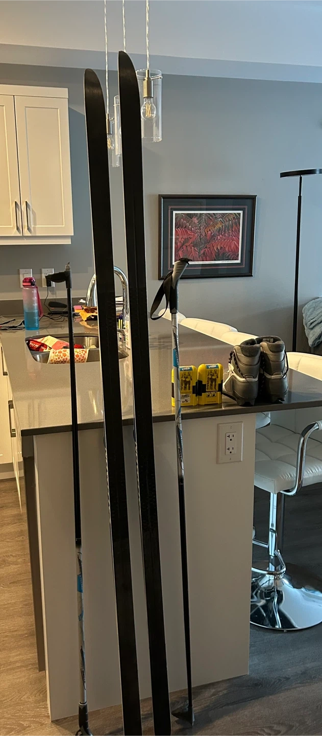 This is a set of Salomon cross-country skis, poles, and boots. The skis feature a blue and silver design. It includes two pairs of ski poles and a pair of winter boots. Great for hitting the trails this season!