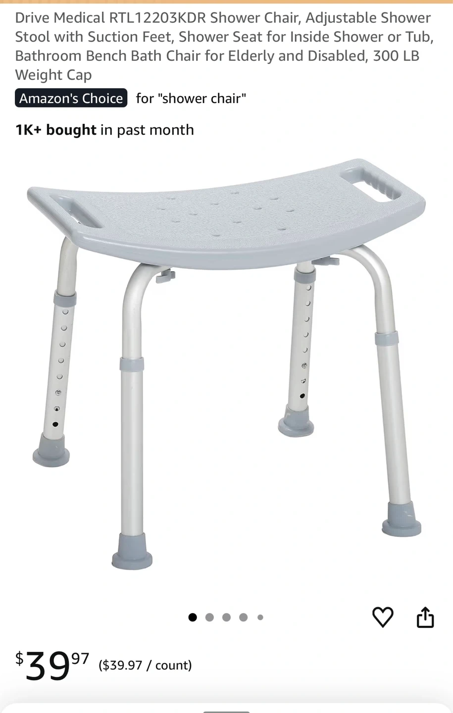 Drive Medical adjustable shower stool with suction feet. Seat height is adjustable from 15.5" to 19.5". It weighs 5 lbs and supports users up to 300 lbs. Perfect for use inside a shower or tub.