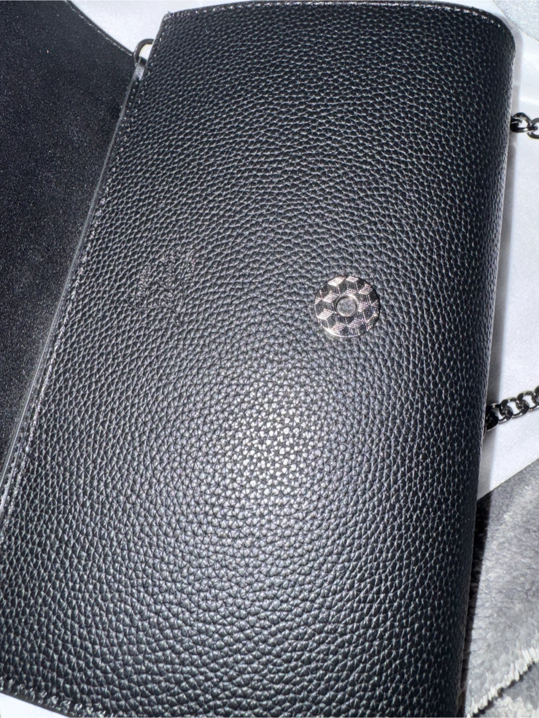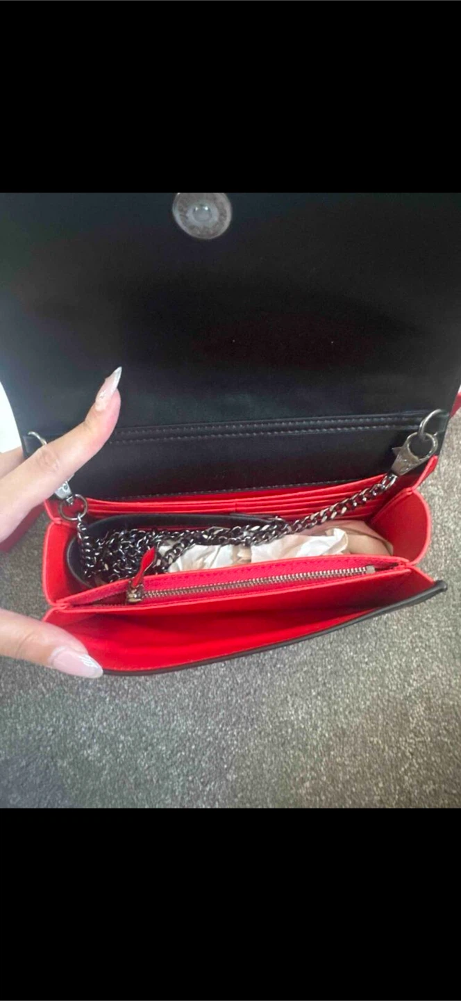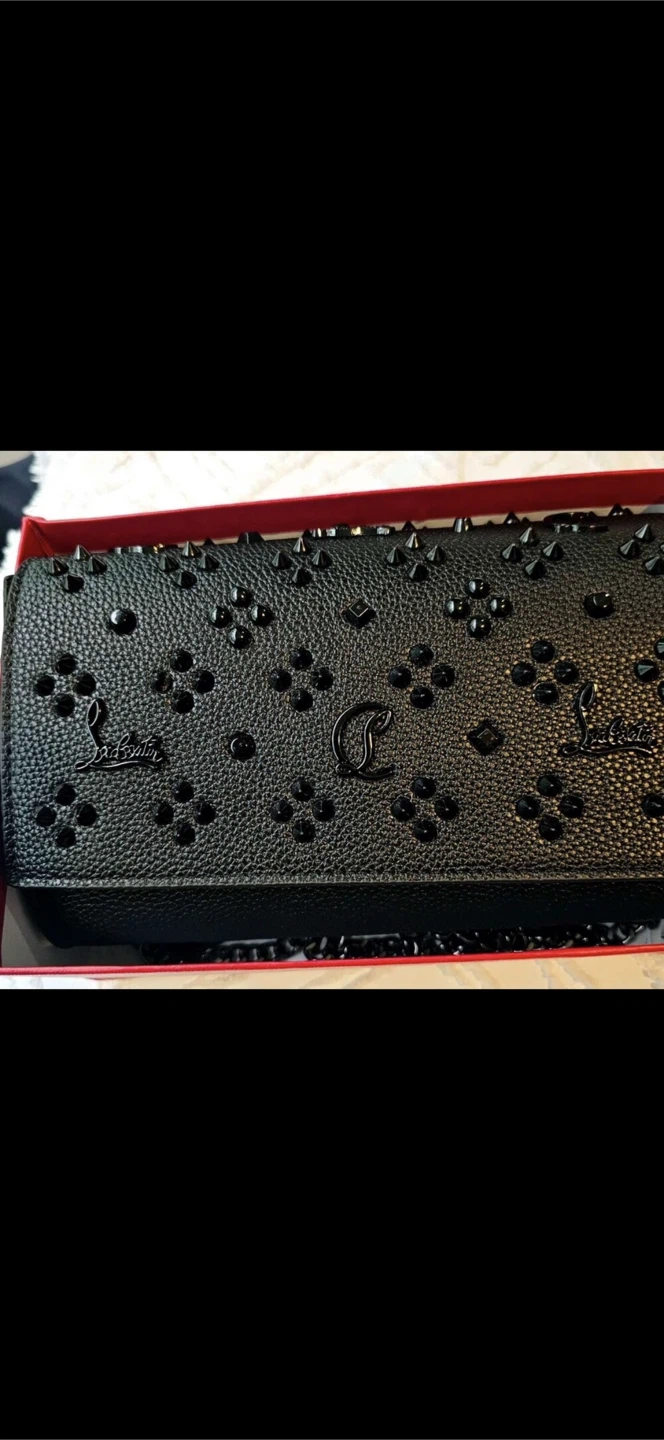 Here’s a Louboutin wallet on a chain. It's a stylish black colour and comes with its box. Perfect for adding a bit of edge to any outfit!