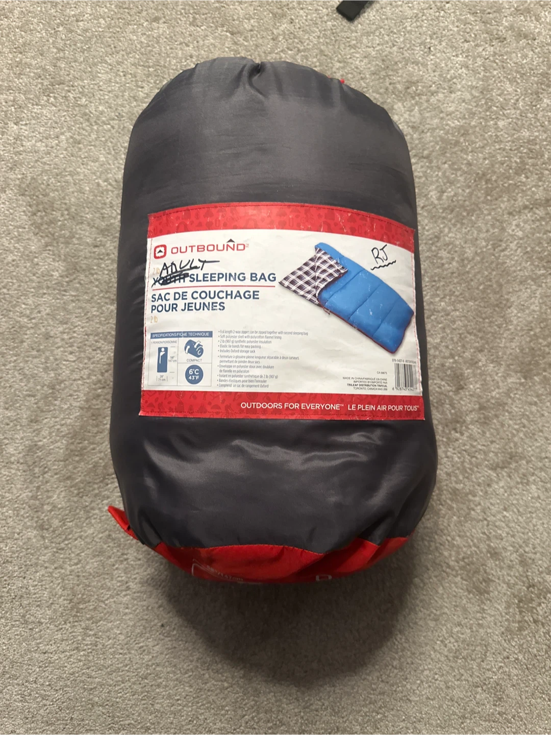 Outbound adult and youth sleeping bag with full-length 2-way zipper. It has polyester insulation and elastic bands for easy packing. Includes an Oxford storage sack.